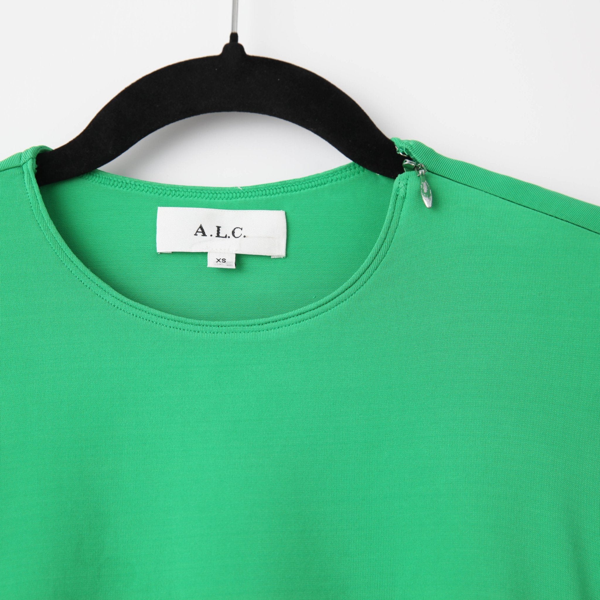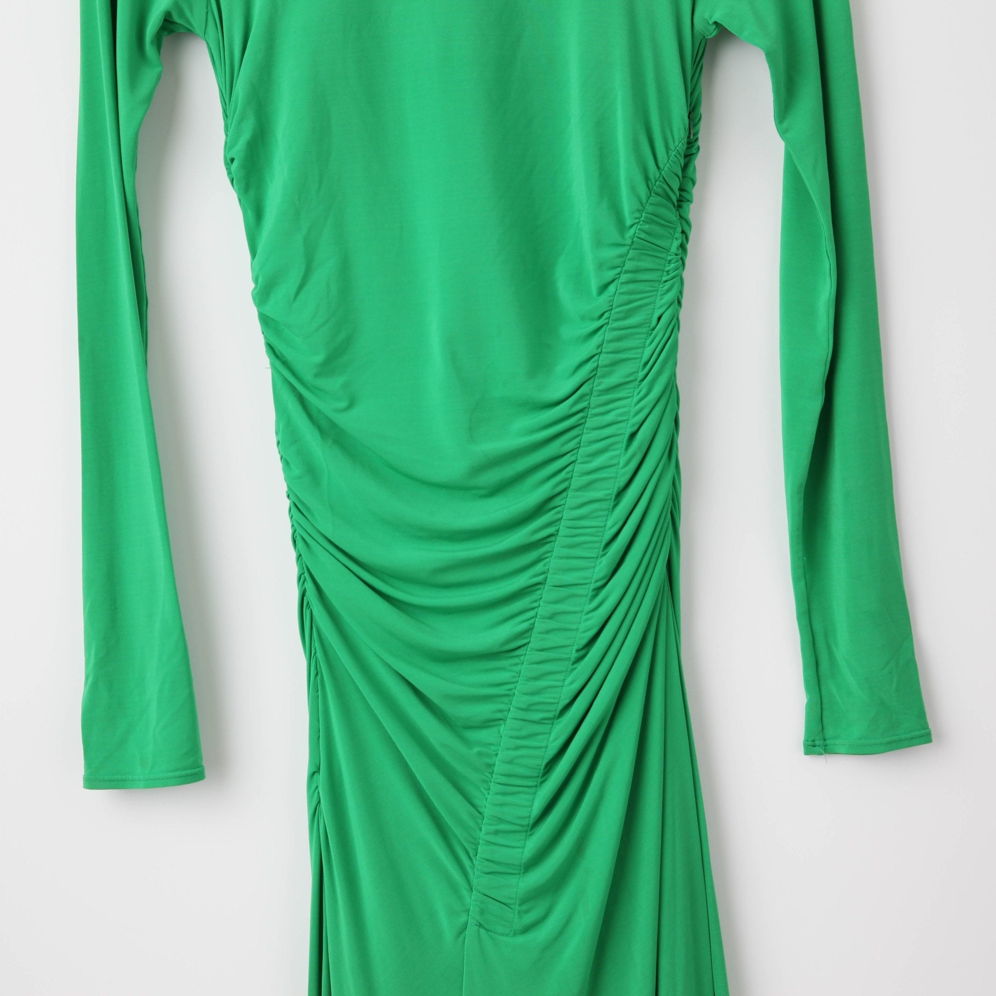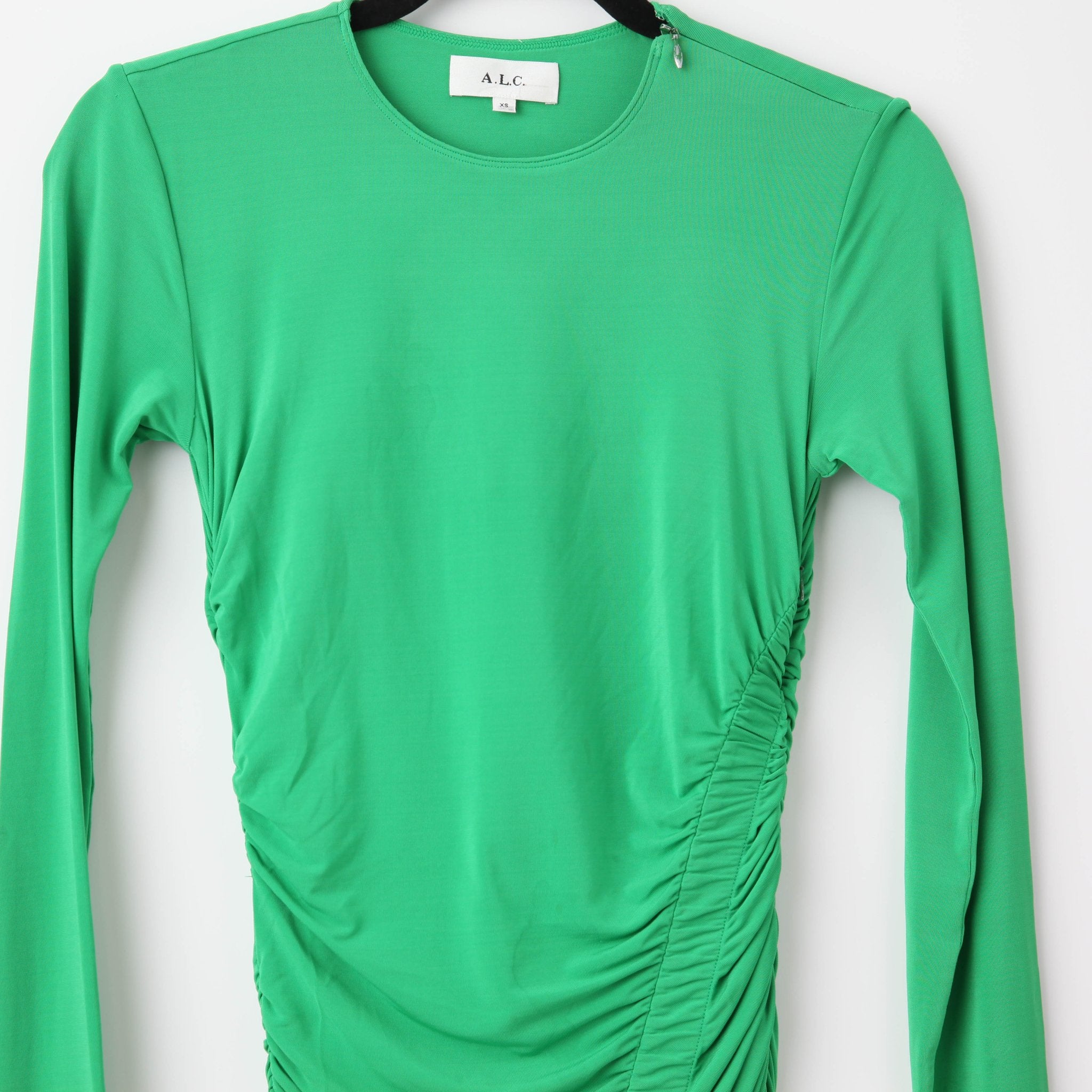 The Adeline Dress by A.L.C. embodies understated sophistication with a modern edge. Crafted from soft ruched jersey fabric, it features a flattering silhouette, asymmetric hem, and subtle stretch for effortless comfort and style. The rich fern green hue adds a touch of contemporary polish — perfect for both day and evening occasions.