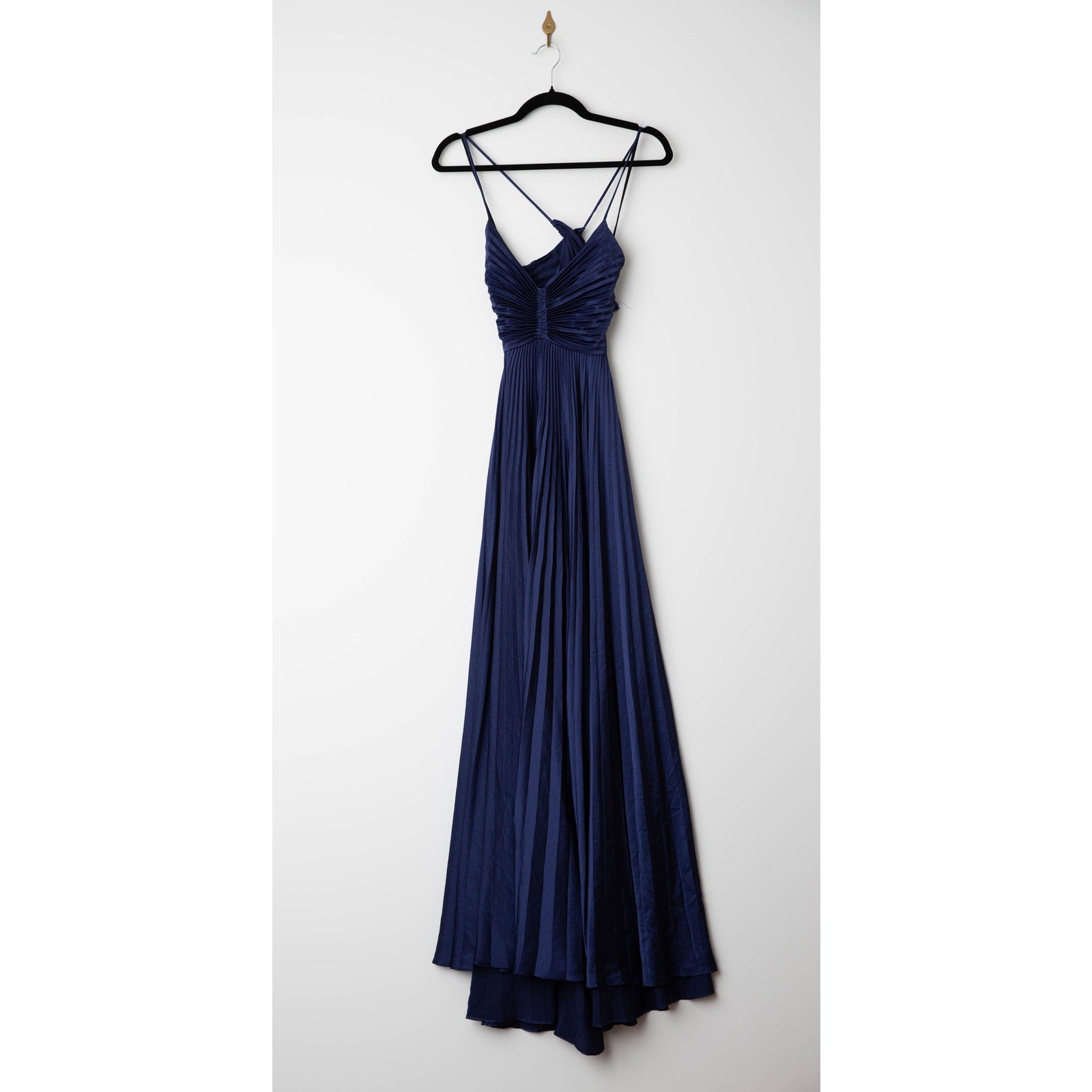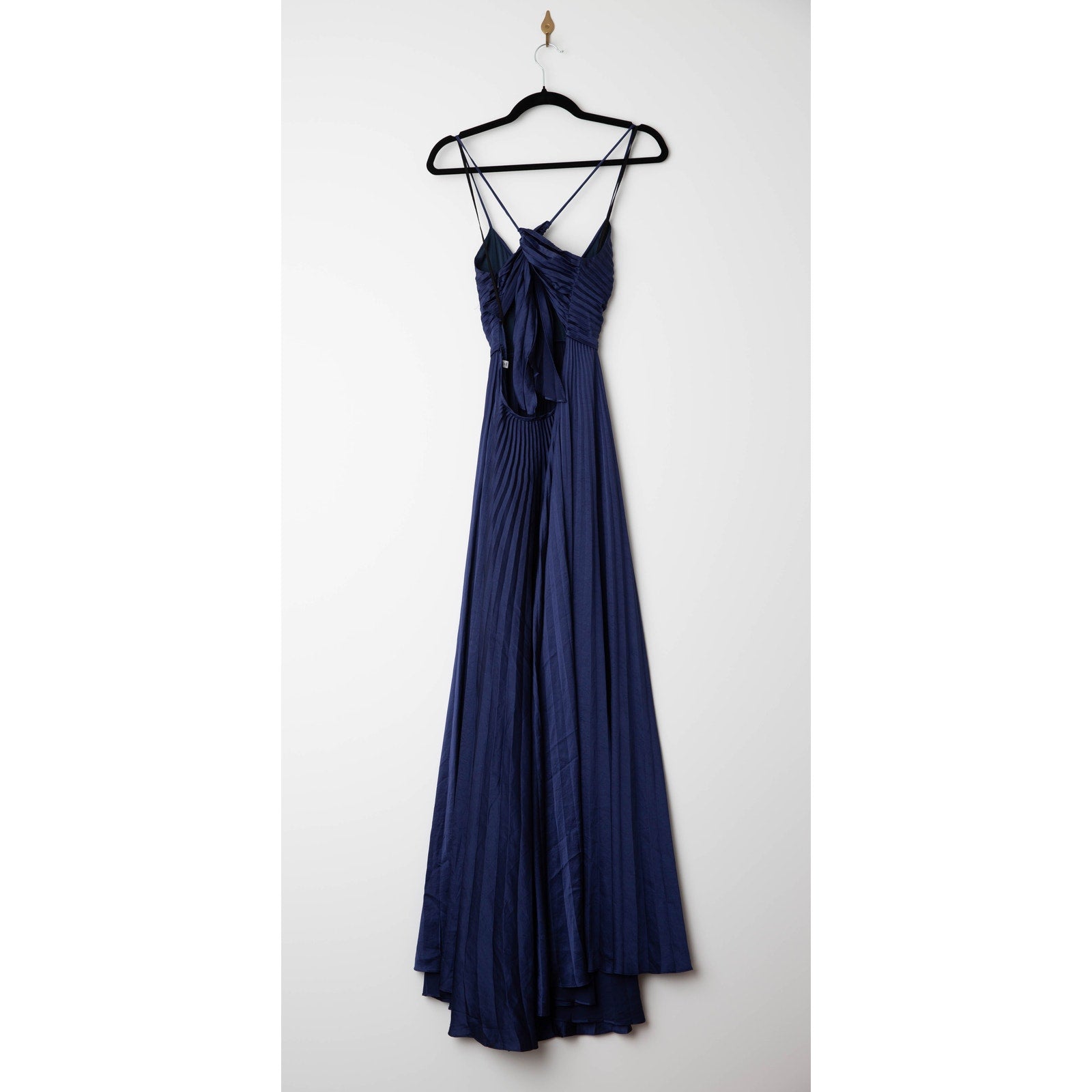 The Aries Maxi Dress by A.L.C. captures modern elegance through perfect pleats that create graceful movement and a waist-defining silhouette. Crafted from lustrous navy satin, this gown’s subtle sheen makes it ideal for formal events — pair it with velvet accessories for a rich, sophisticated finish.