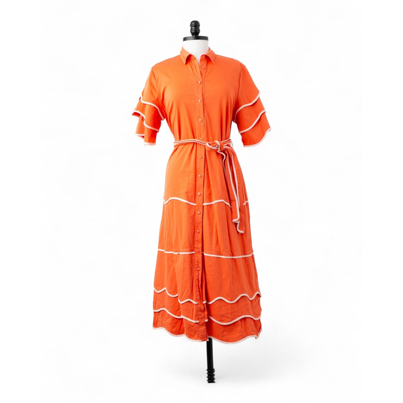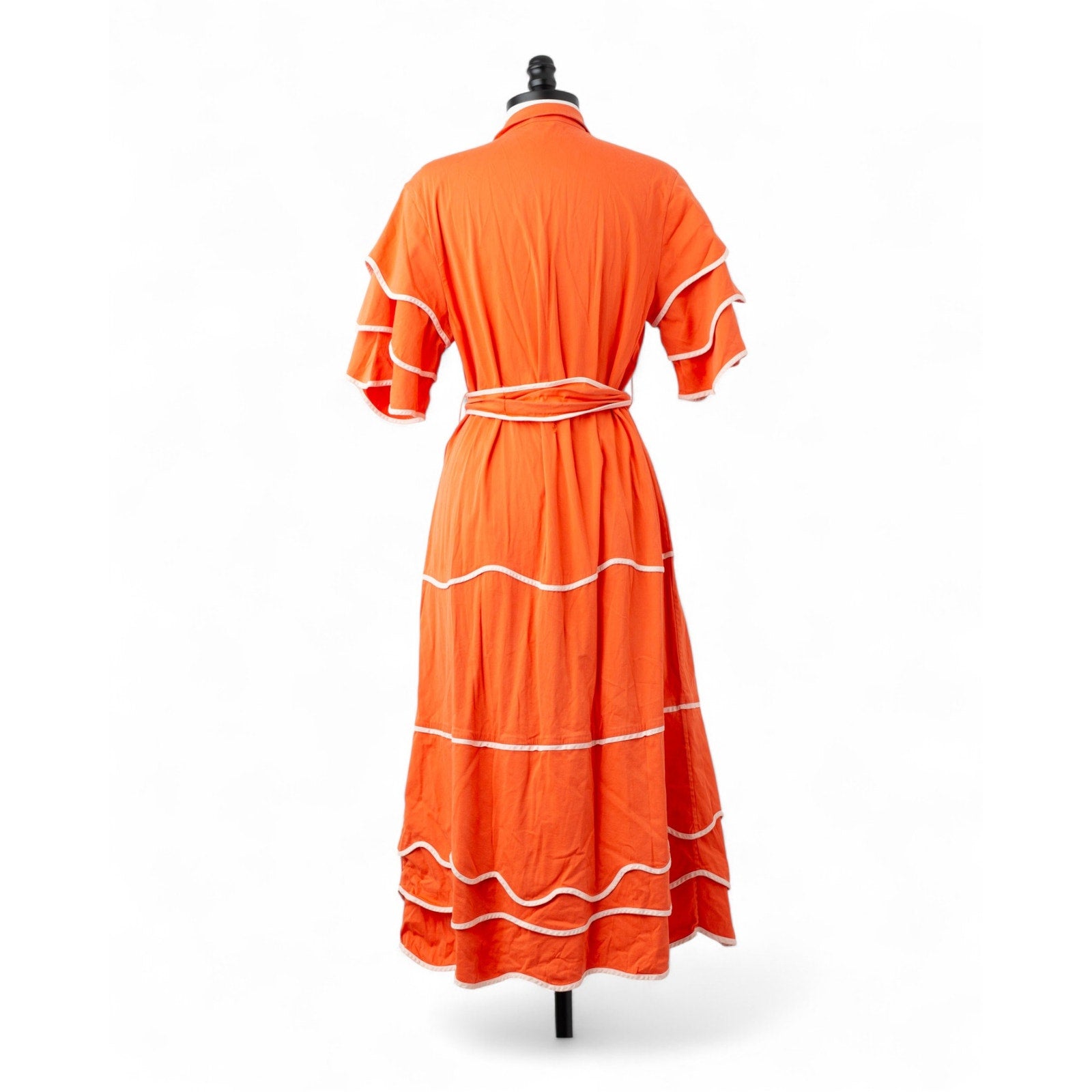 Radiant and refined, this Alexis Rhodes dress captures effortless sophistication in a vibrant orange hue. Designed with a structured silhouette, collared neckline, and button-front closure, it embodies confident femininity and modern charm. A timeless piece with stories to tell — waiting to be reimagined through care and creativity.