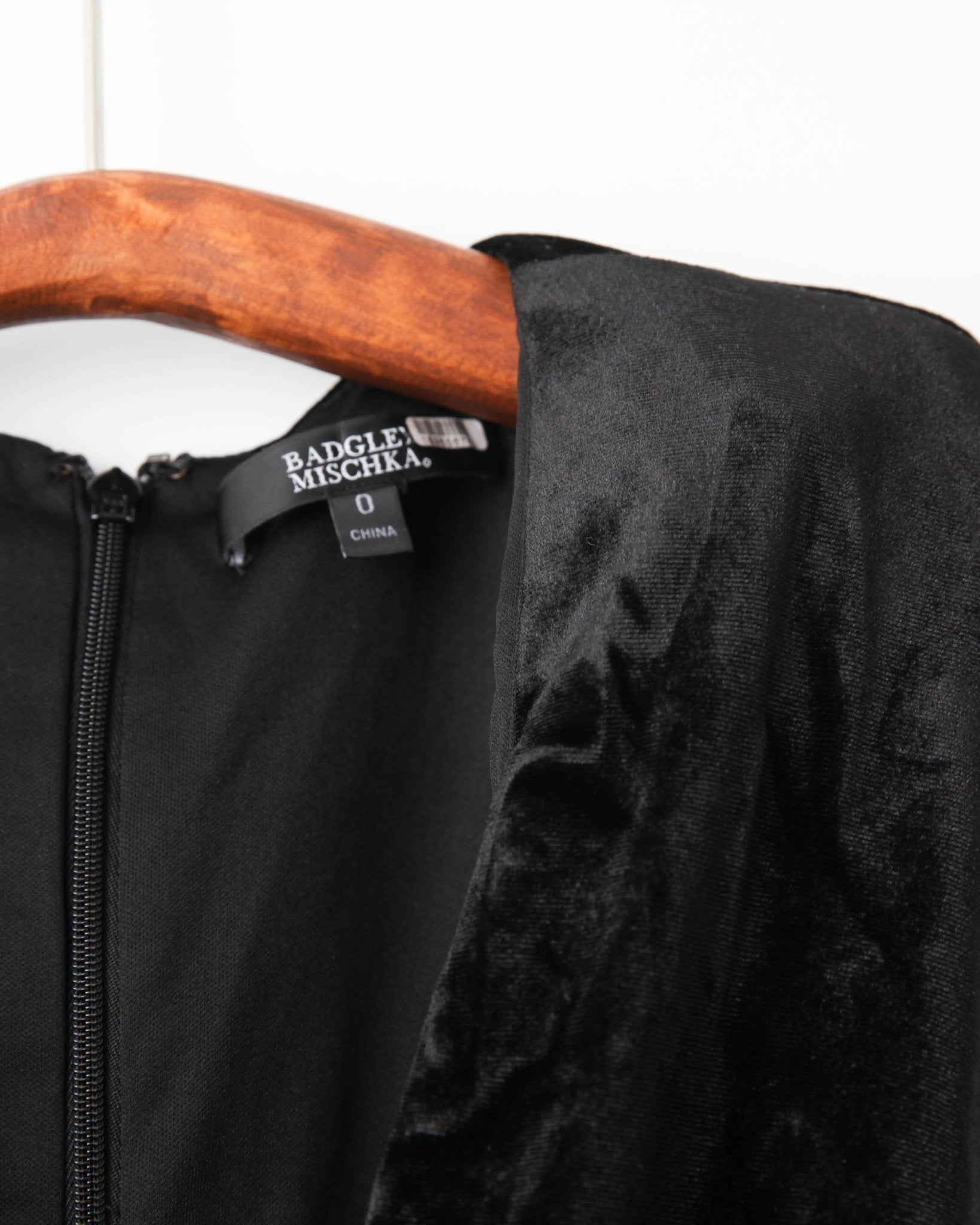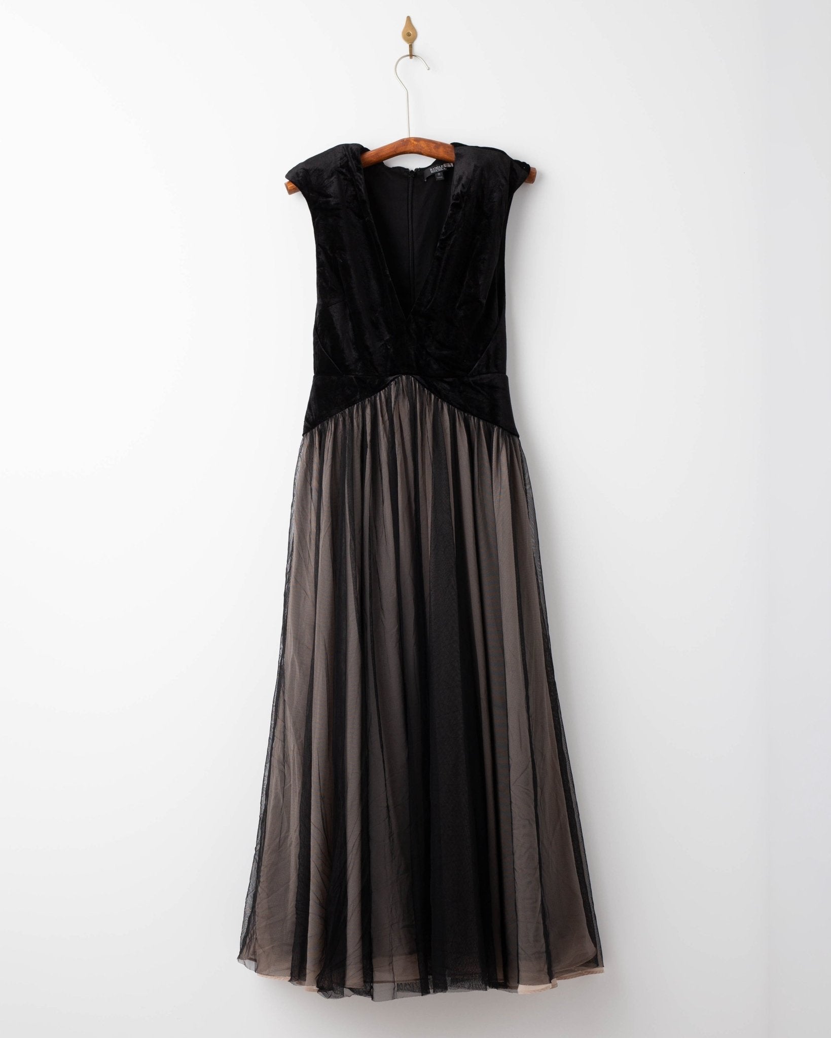 Channel vintage glamour with a modern twist in this Badgley Mischka drop-waist dress, a sophisticated nod to 1950s couture. The black floral velvet bodice creates rich texture and depth, while the full skirt and plunging V-neckline add graceful movement and allure. Perfect for cocktail parties, formal gatherings, or any moment that calls for refined elegance.