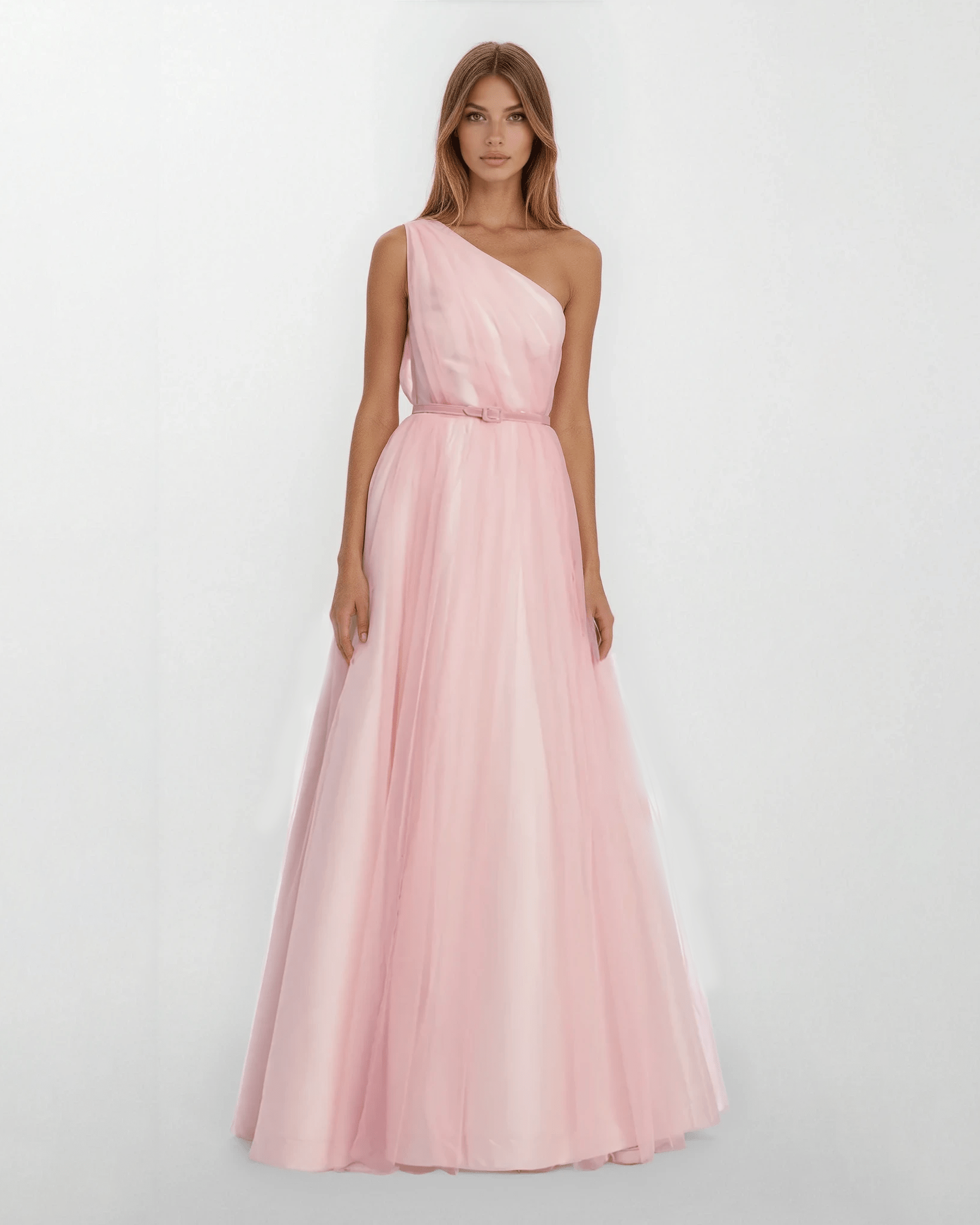 Make a graceful entrance in this ethereal one-shoulder tulle gown by Badgley Mischka. Designed with a soft asymmetrical neckline and a flowing, romantic silhouette, this gown brings effortless elegance to any special occasion.