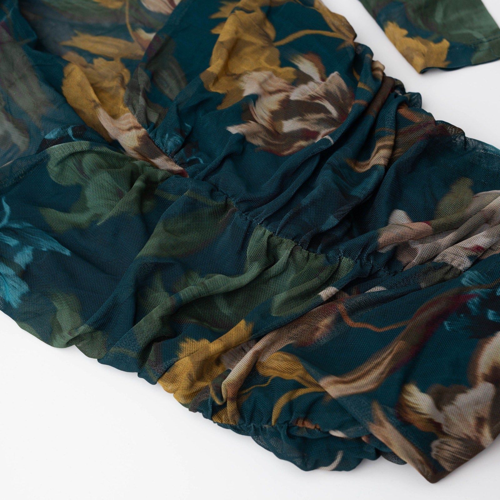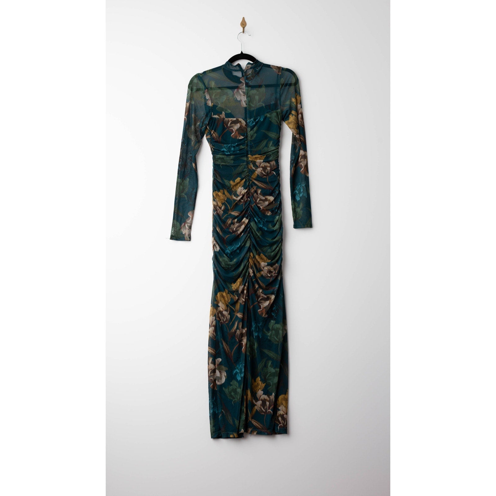 Blue floral jersey (92% Polyamide, 8% Elastane). Sheath silhouette. Long sleeves. Crew neckline. Back zipper closure.