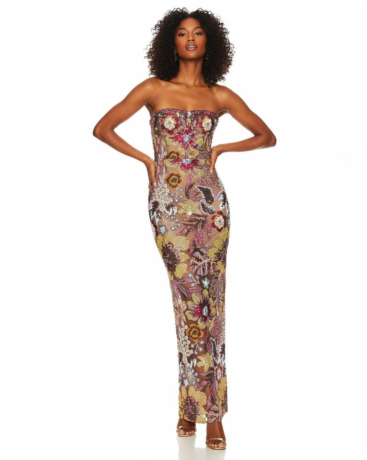 A stunning creation by Bronx and Banco, the Dahlia Gown captivates with its strapless silhouette and vibrant, sequined floral design — a celebration of glamour, craftsmanship, and individuality. Each detail sparkles with character, reflecting the beauty of transformation and the charm of renewal.