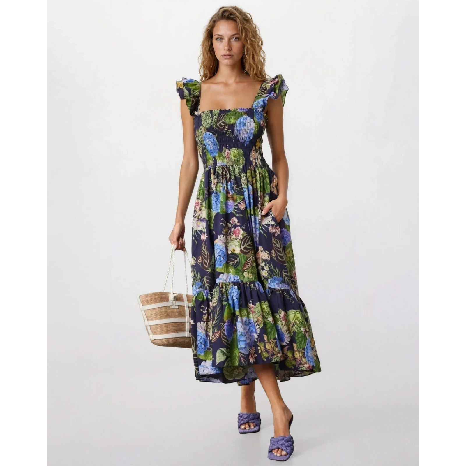 Cara Cara New York Ruby Blue Floral Midi Dress | Size M, Pre-Owned