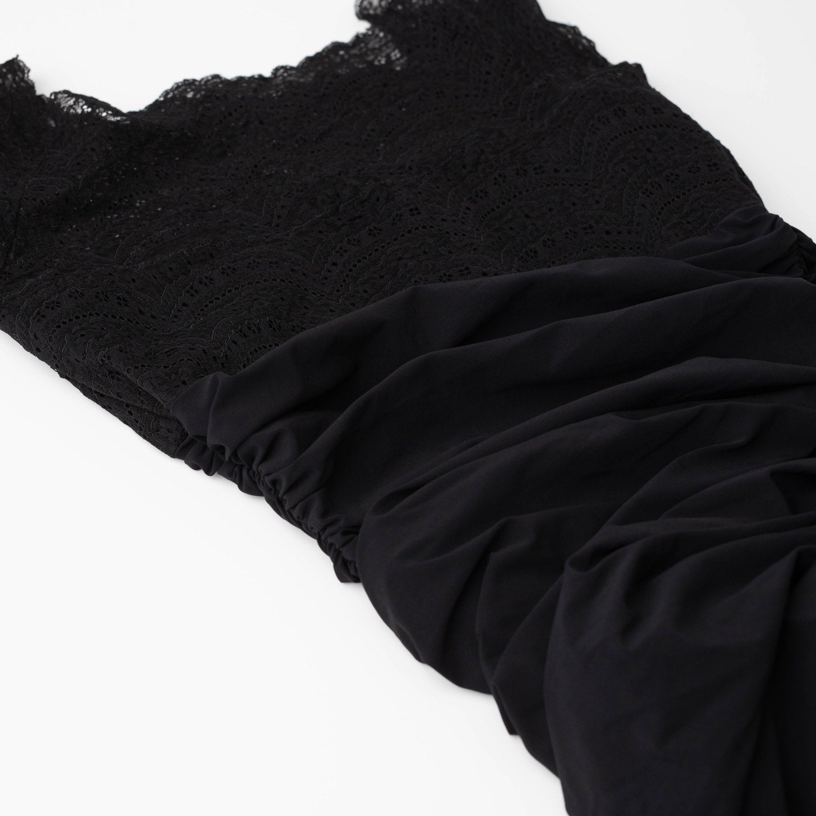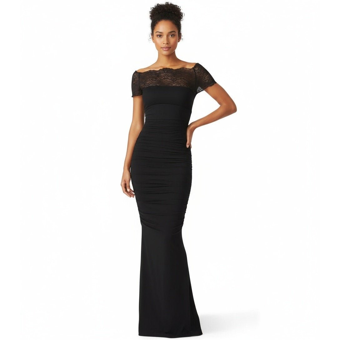 Sleek and sophisticated, the Nasira Gown by Chiara Boni La Petite Robe combines timeless elegance with a touch of modern allure. Crafted from Chiara Boni’s signature stretch ponte fabric, this gown features a boat neckline with illusion lace detail, short sleeves, and a ruched bodice that flatters the silhouette beautifully.