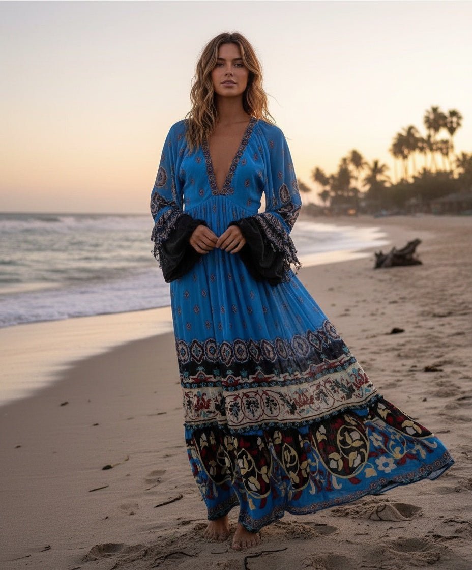 Bring vibrant energy to your wardrobe with the Anika Tiles Maxi Dress by FARM Rio. Crafted in bold blue hues and an eclectic tile-inspired print, this piece captures the joyful spirit of the brand. Flowing sleeves, a flattering V-neckline, and a maxi-length silhouette make it perfect for sunny escapes or effortless everyday elegance.