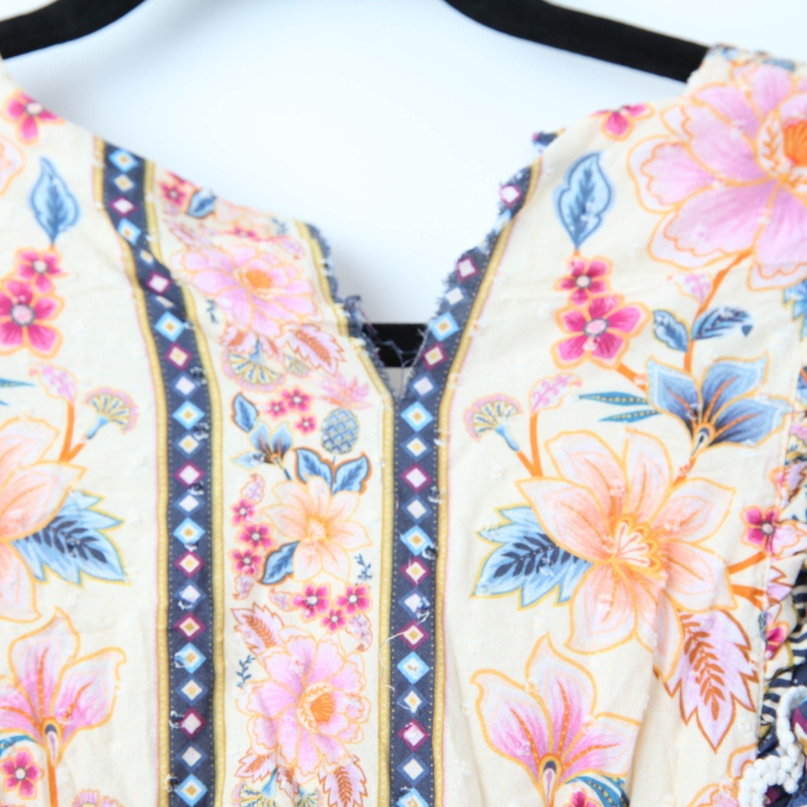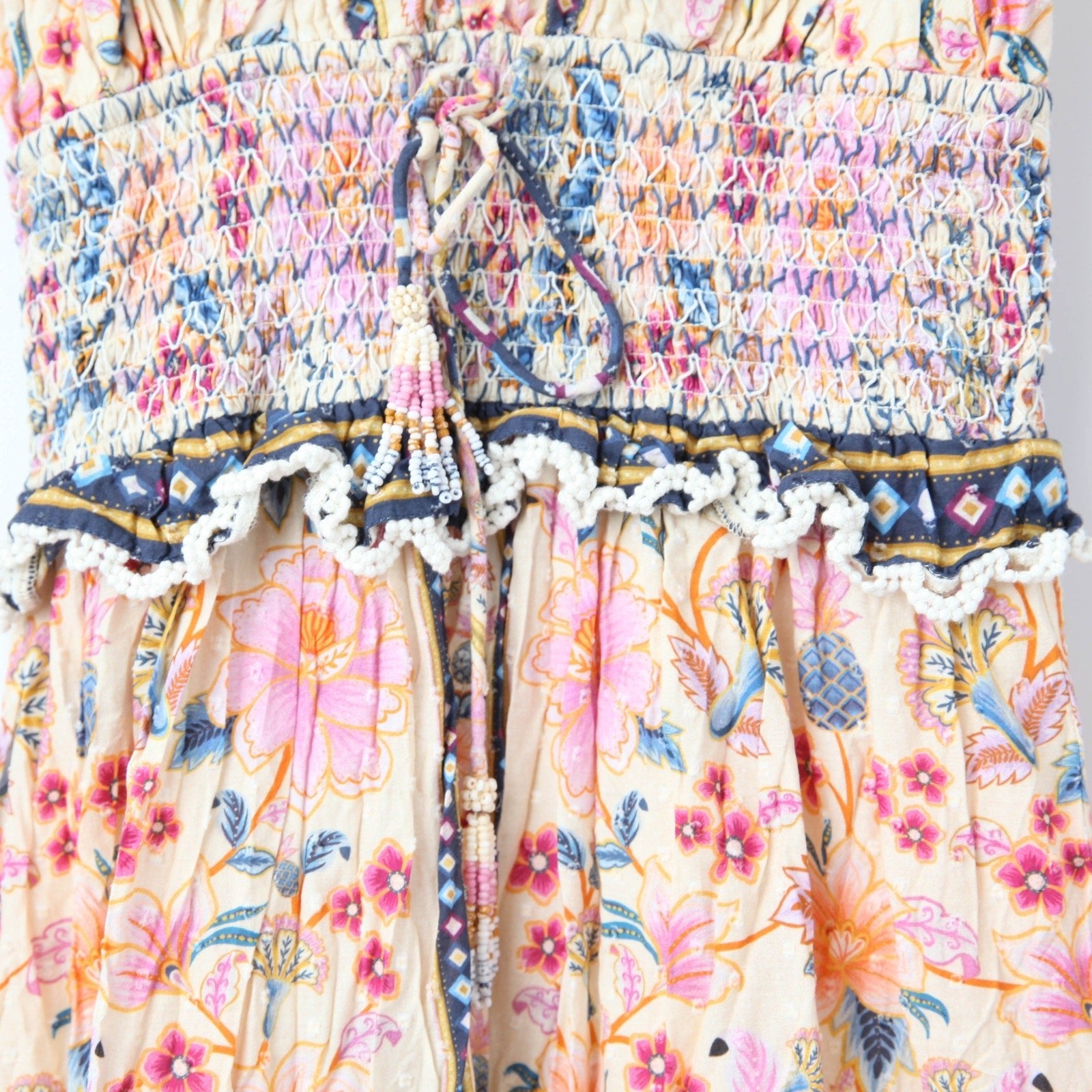 The Superbloom Midi Dress by FARM Rio captures the brand’s signature joyful spirit with its vibrant floral print and playful silhouette. Designed with a smocked bodice, plunging V-neckline, and elasticated drawstring waist, it flatters effortlessly while bringing a touch of laid-back elegance to any day.