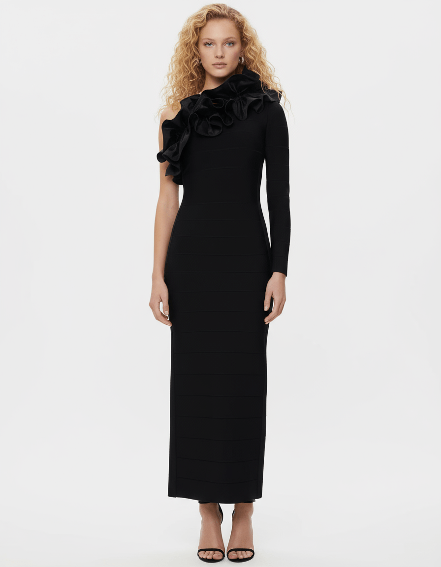 Hervé Léger Asymmetrical Ruffle Gown in Black