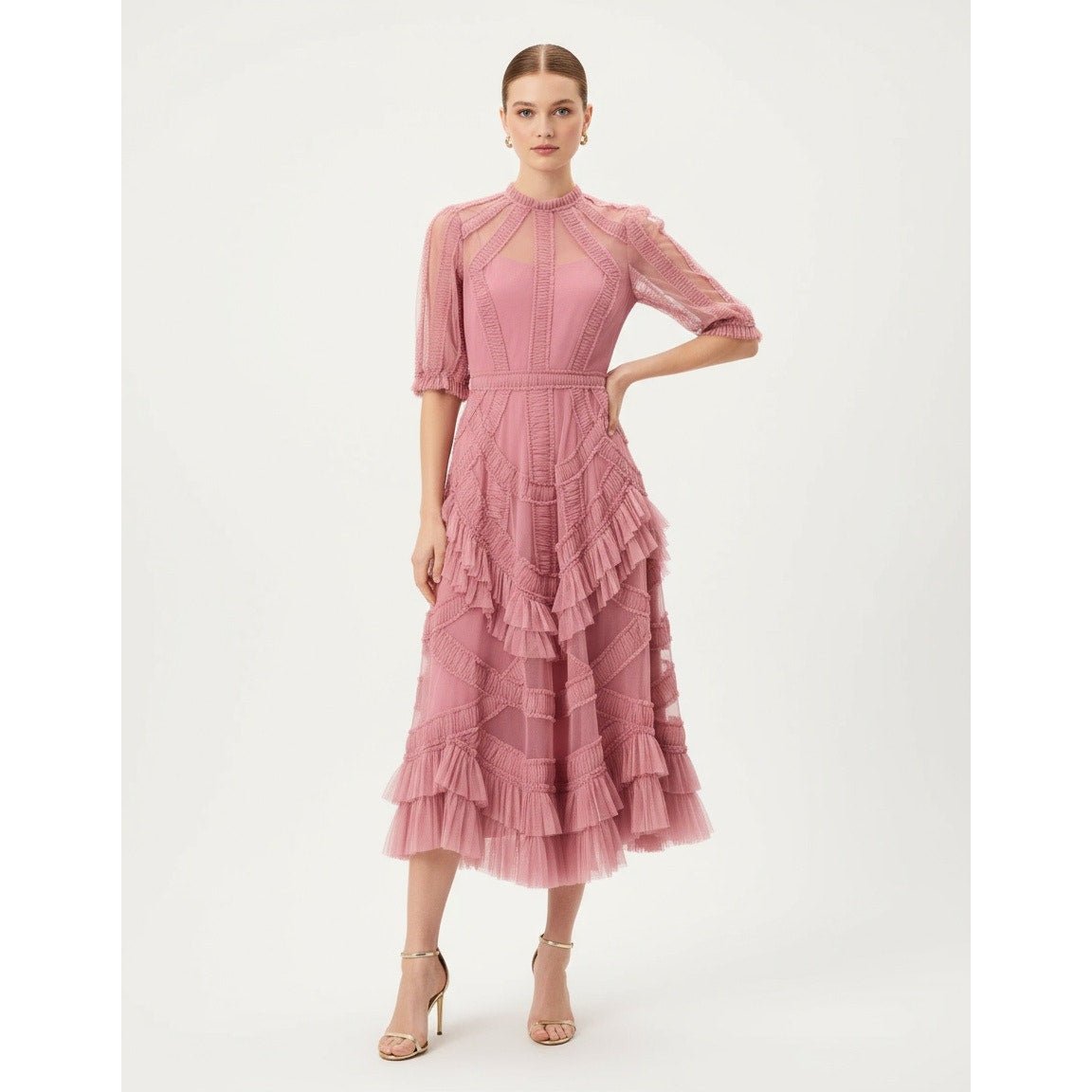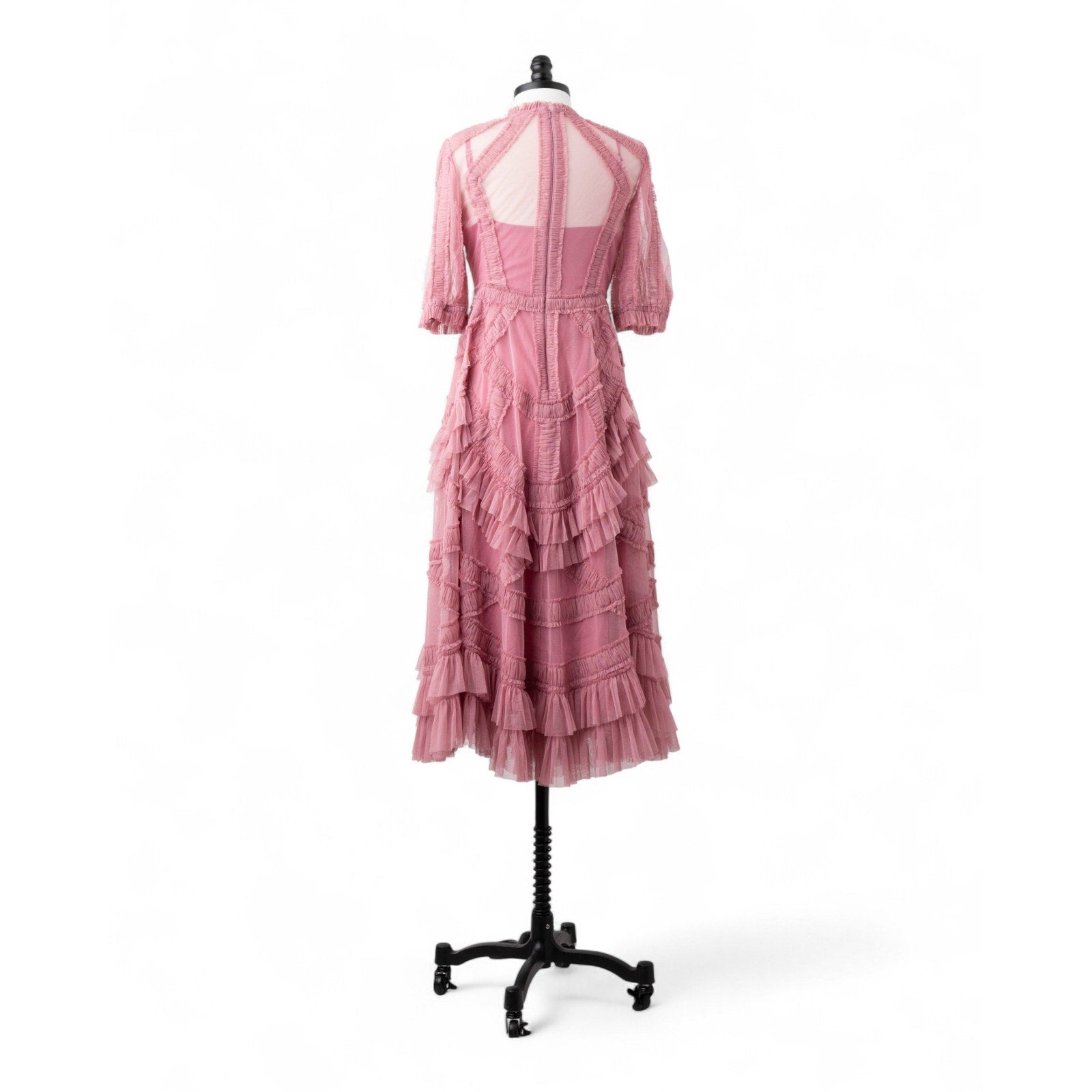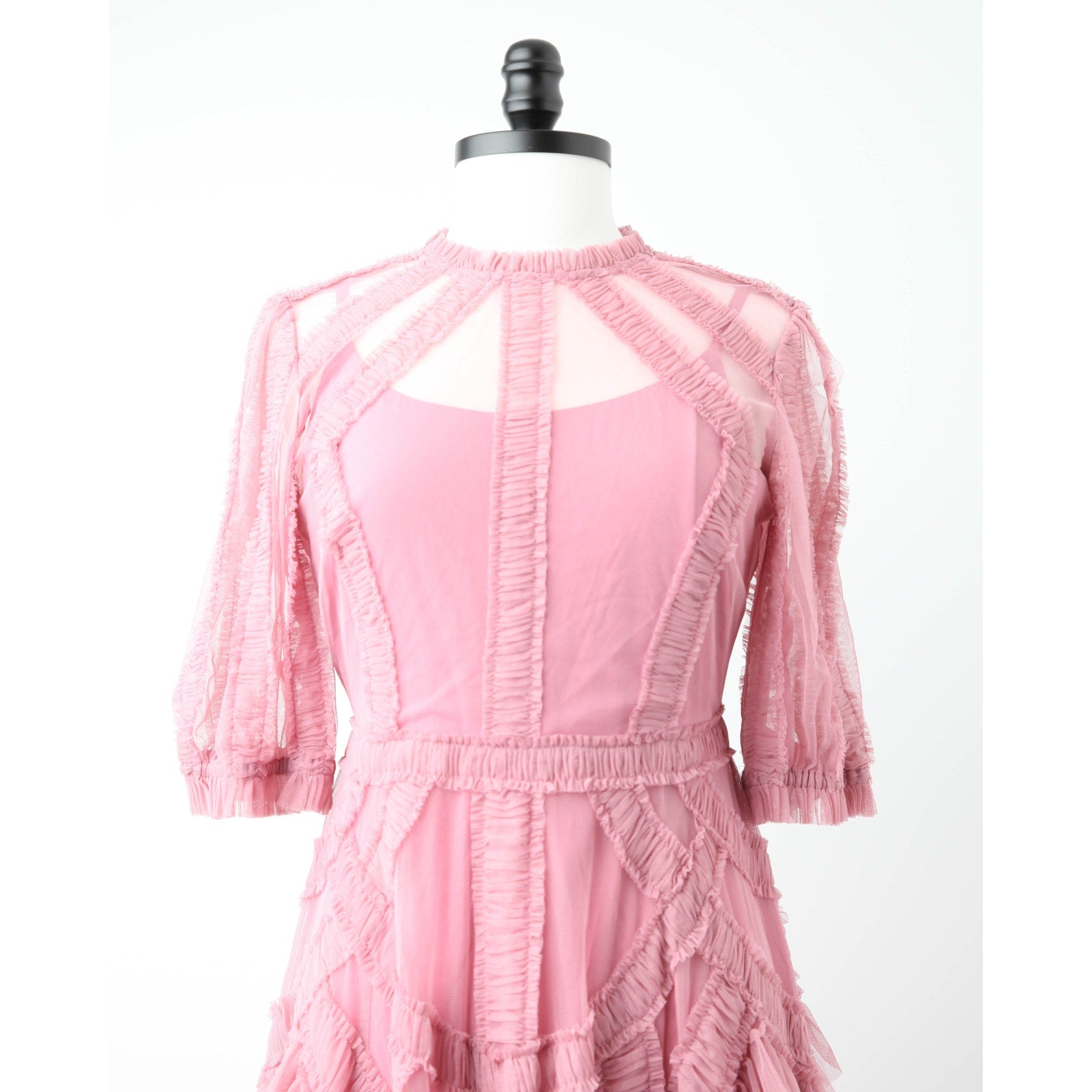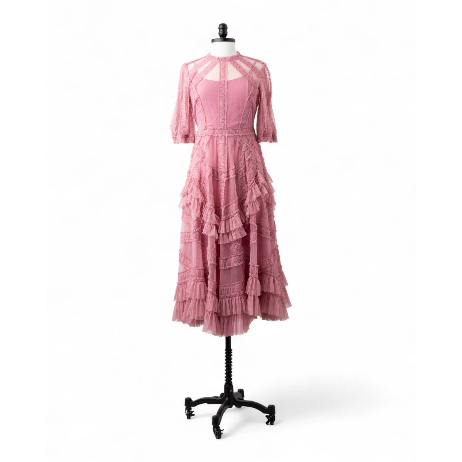 Features: High neck, puff sleeves, ruffle tiers, side zipper closure