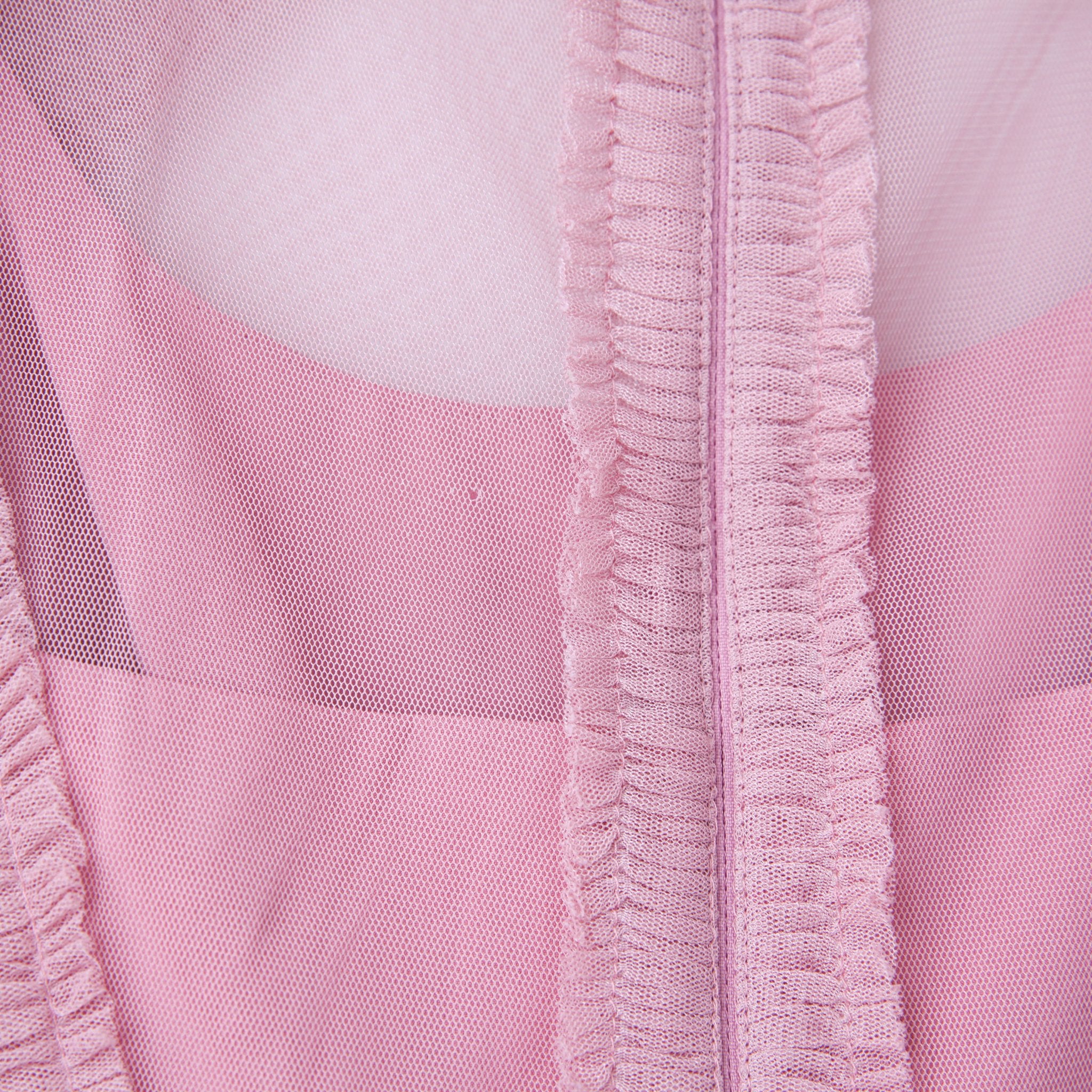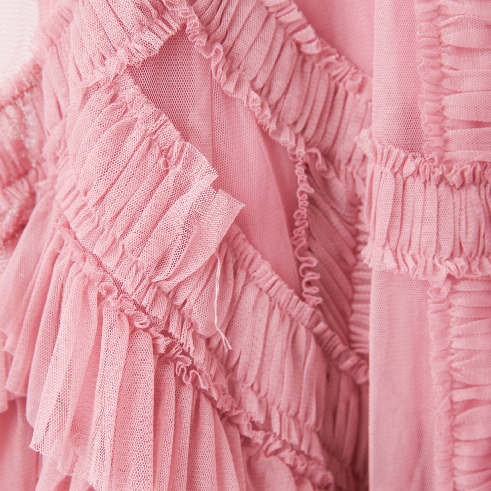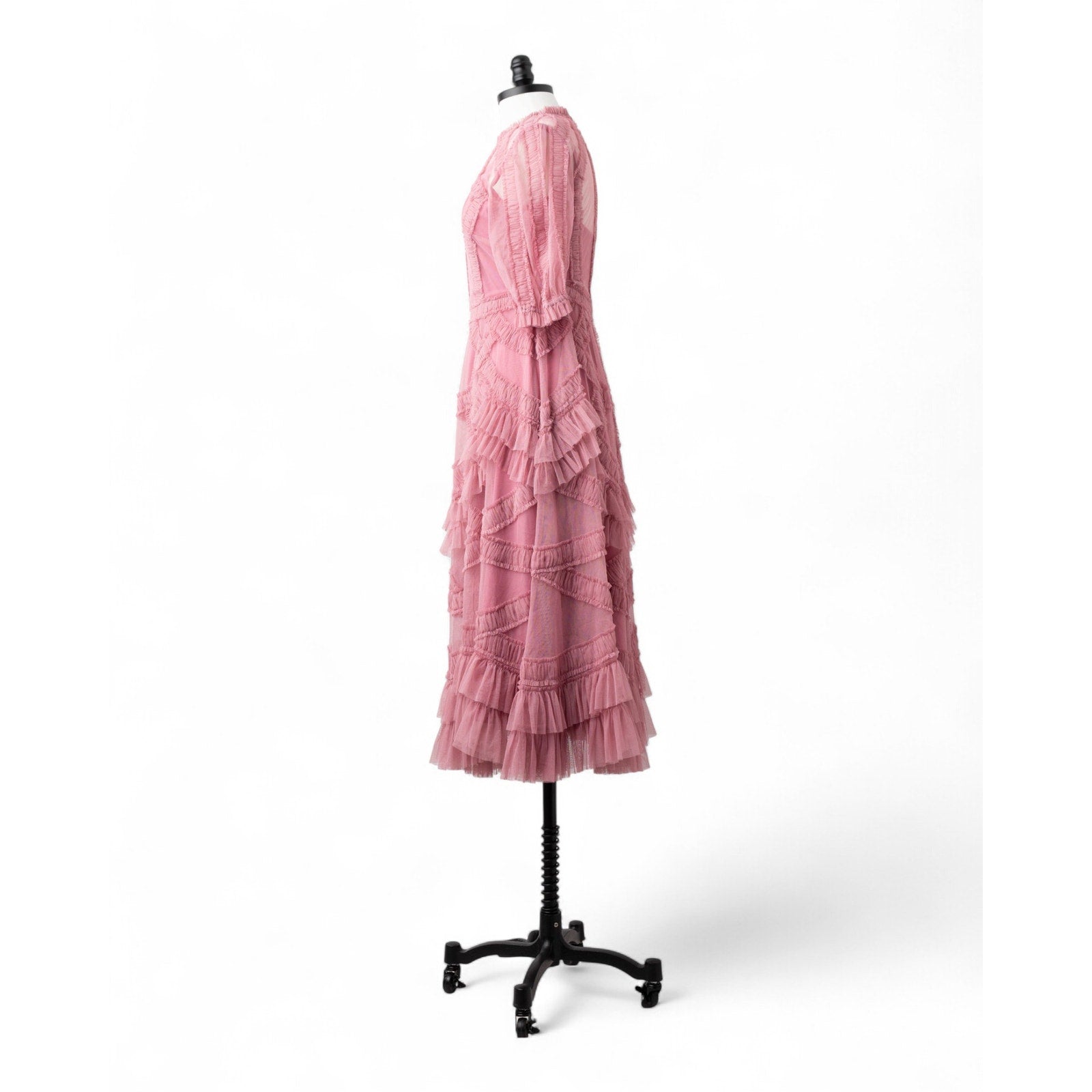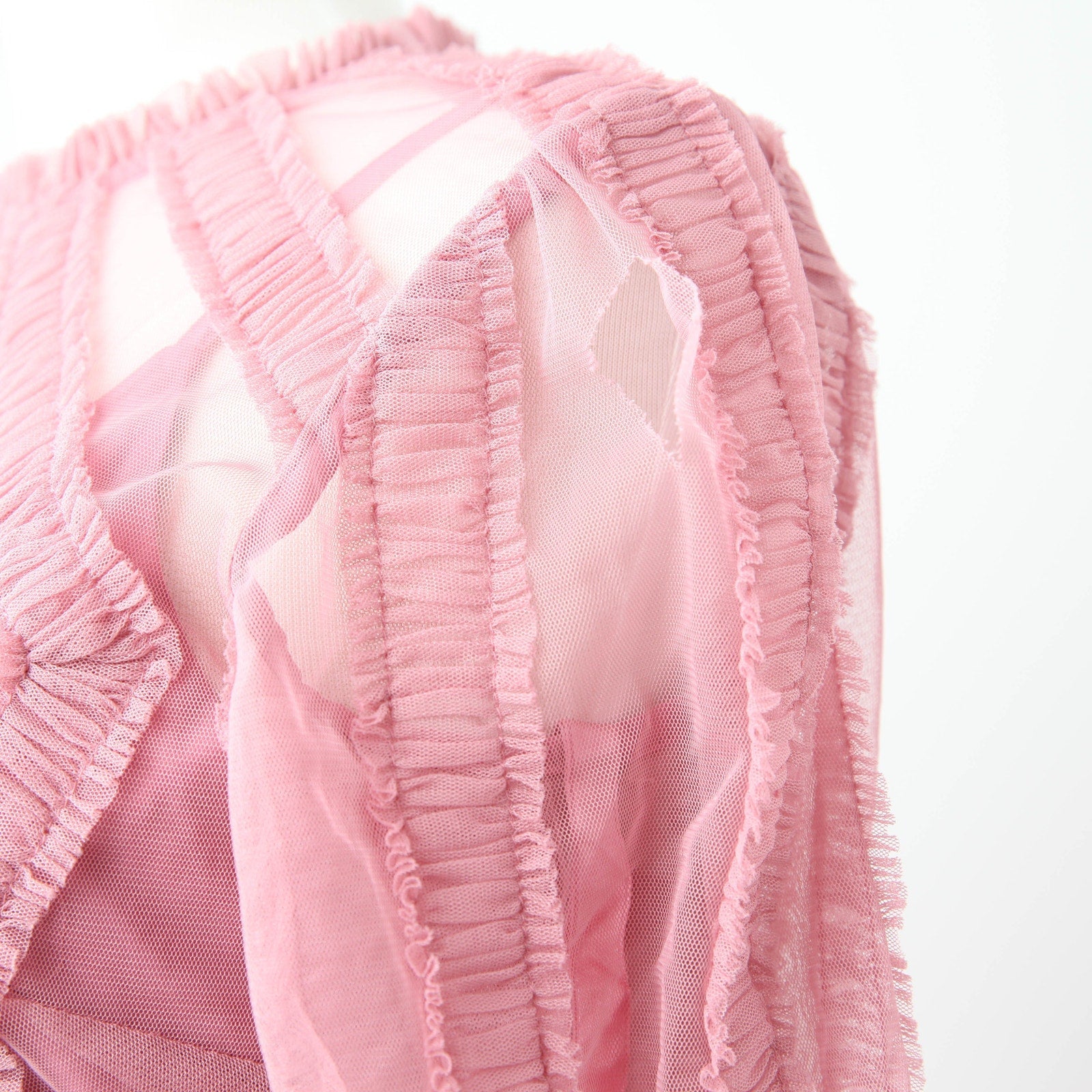 Features: High neck, puff sleeves, ruffle tiers, side zipper closure