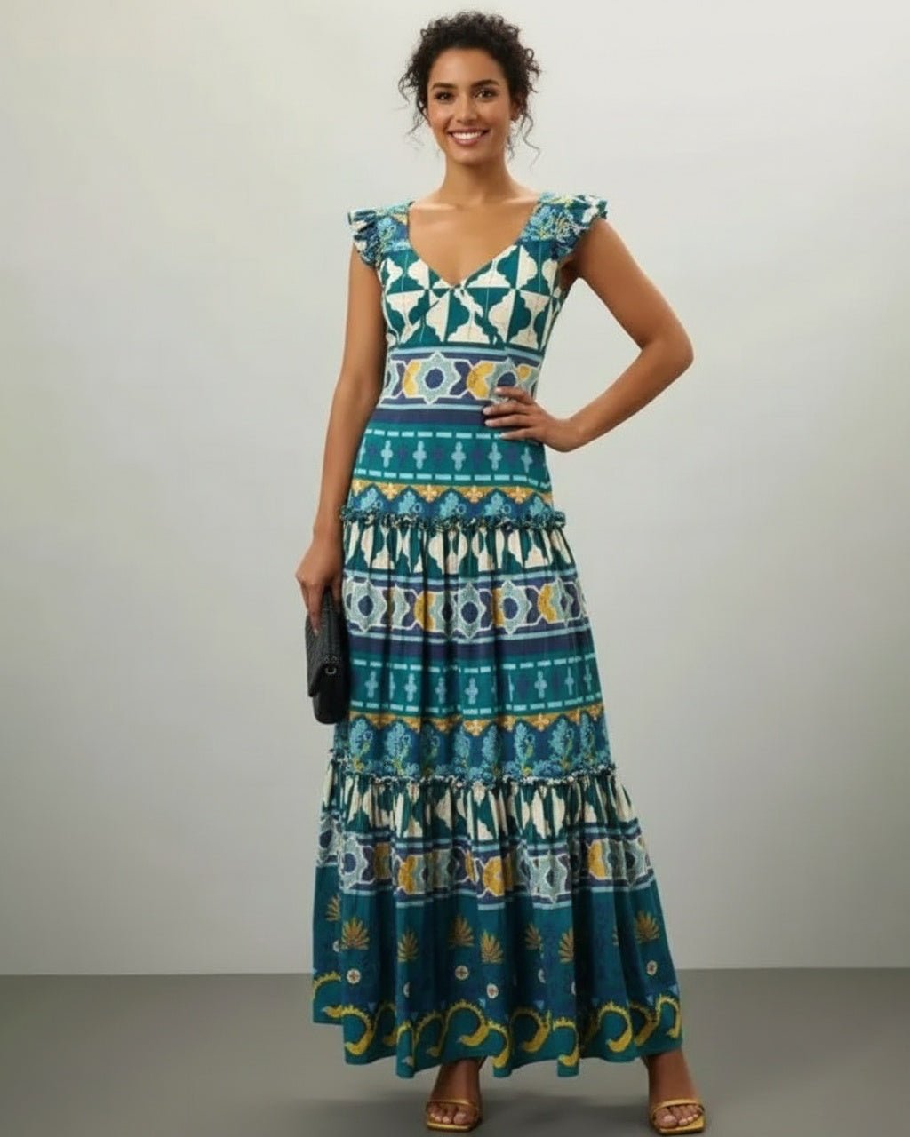 Crafted from stretchy jersey to flatter curves, this dress boasts a dropped waist and ruched tiers for a modern, festive look.