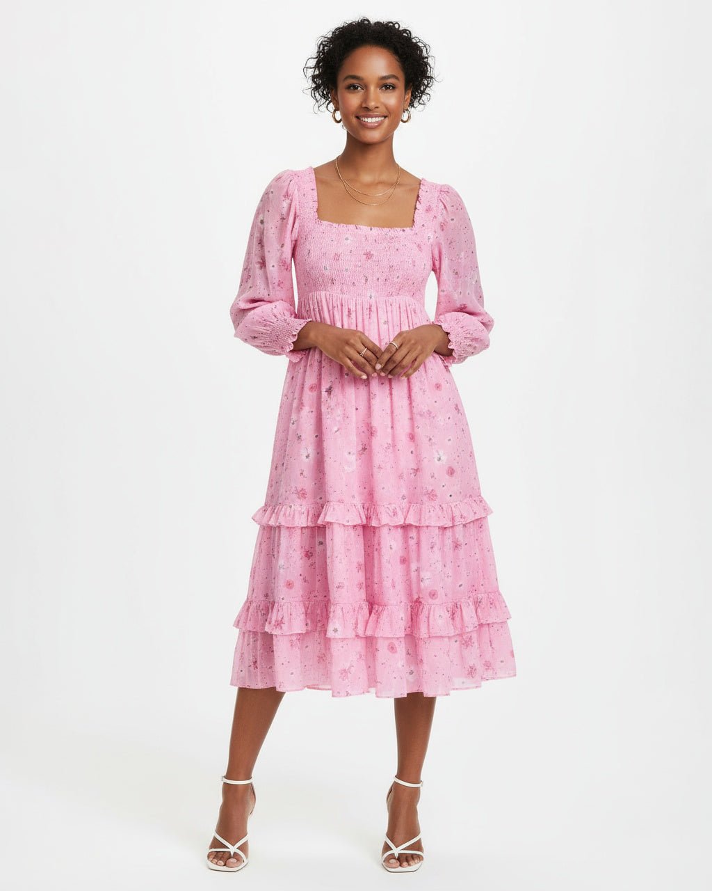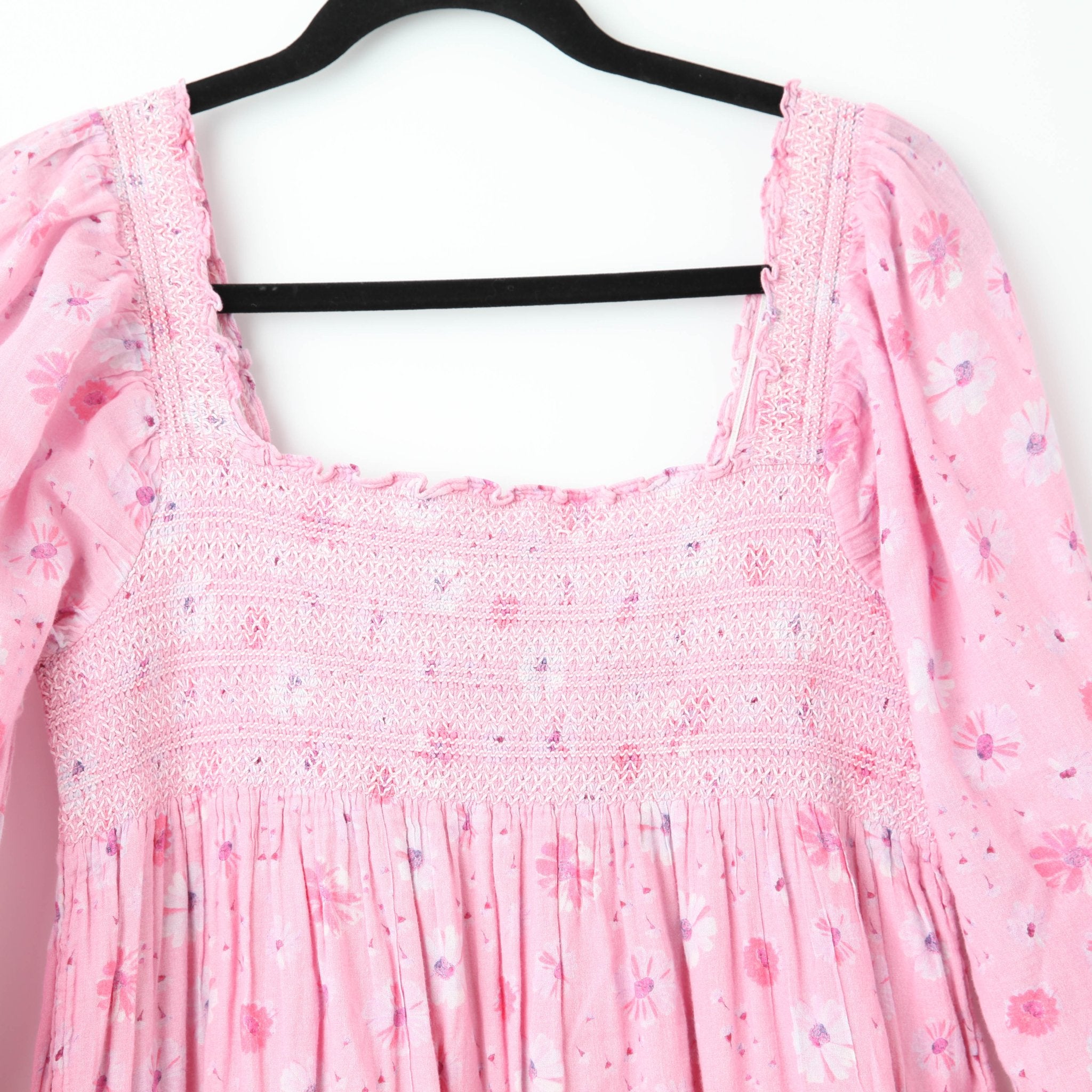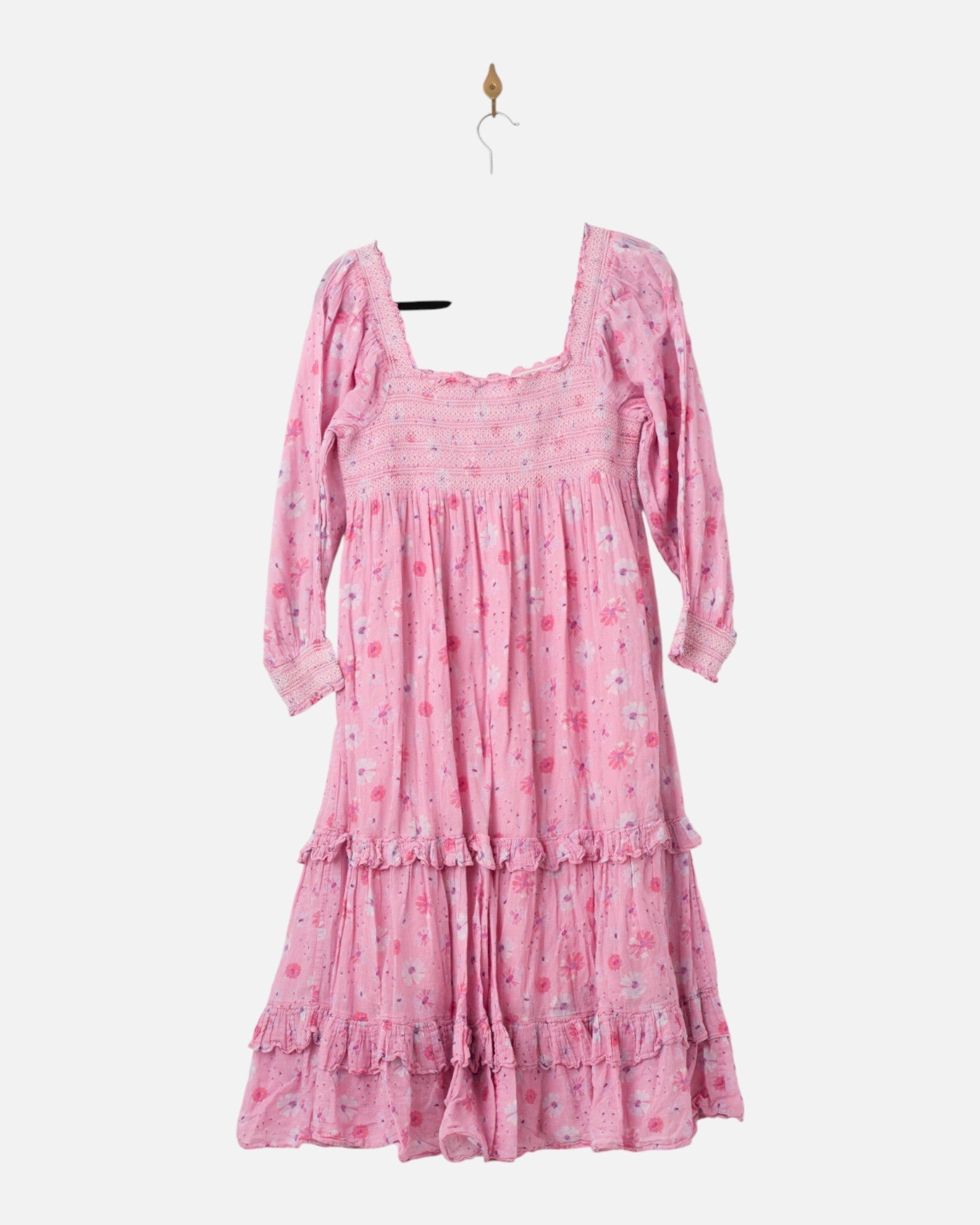 The Miri Dress by LoveShackFancy is effortlessly charming — a romantic silhouette featuring puff sleeves, delicate smocking, and soft ruffle details. Crafted from 100% pink cotton, this piece embodies the label’s signature feminine aesthetic, blending comfort with timeless sweetness.