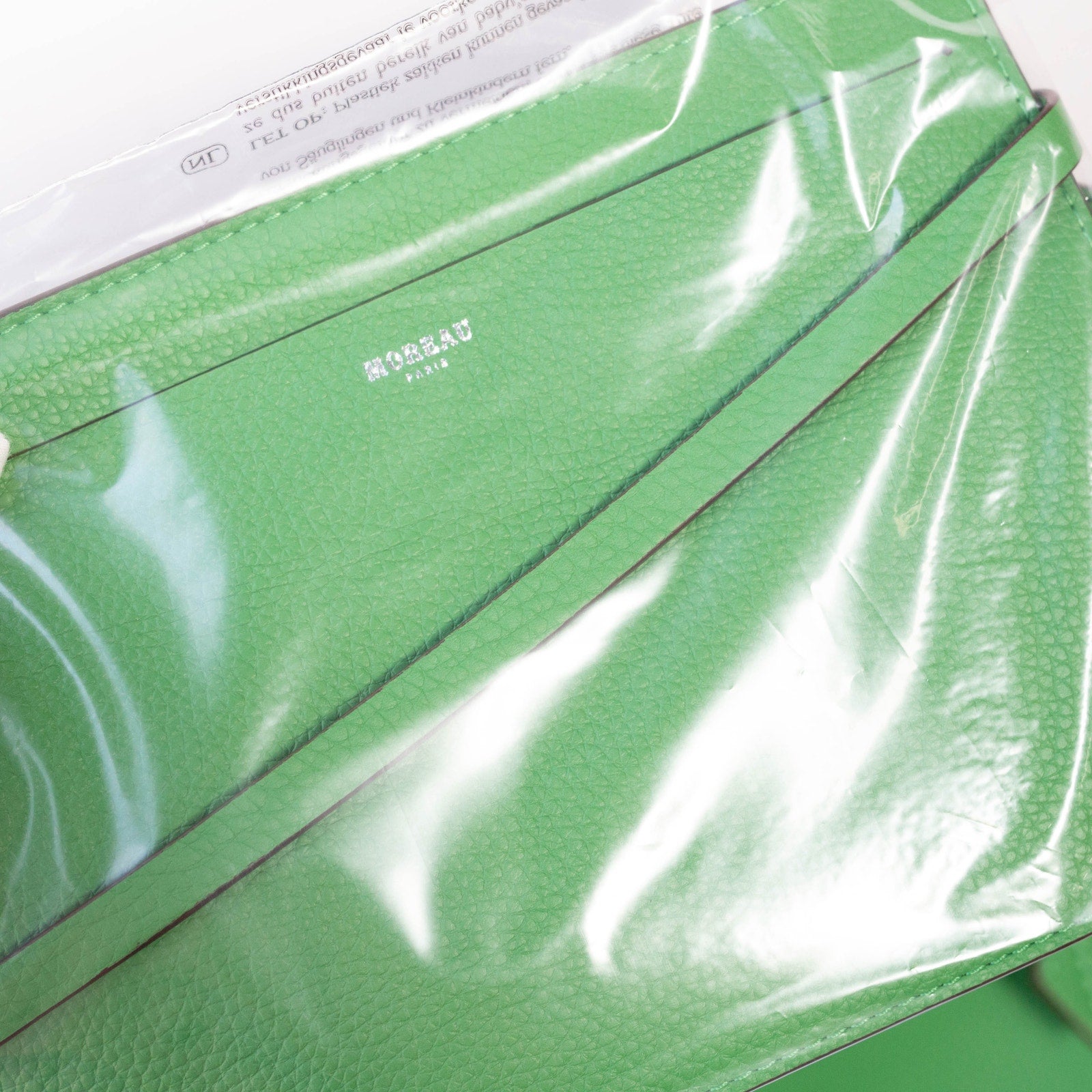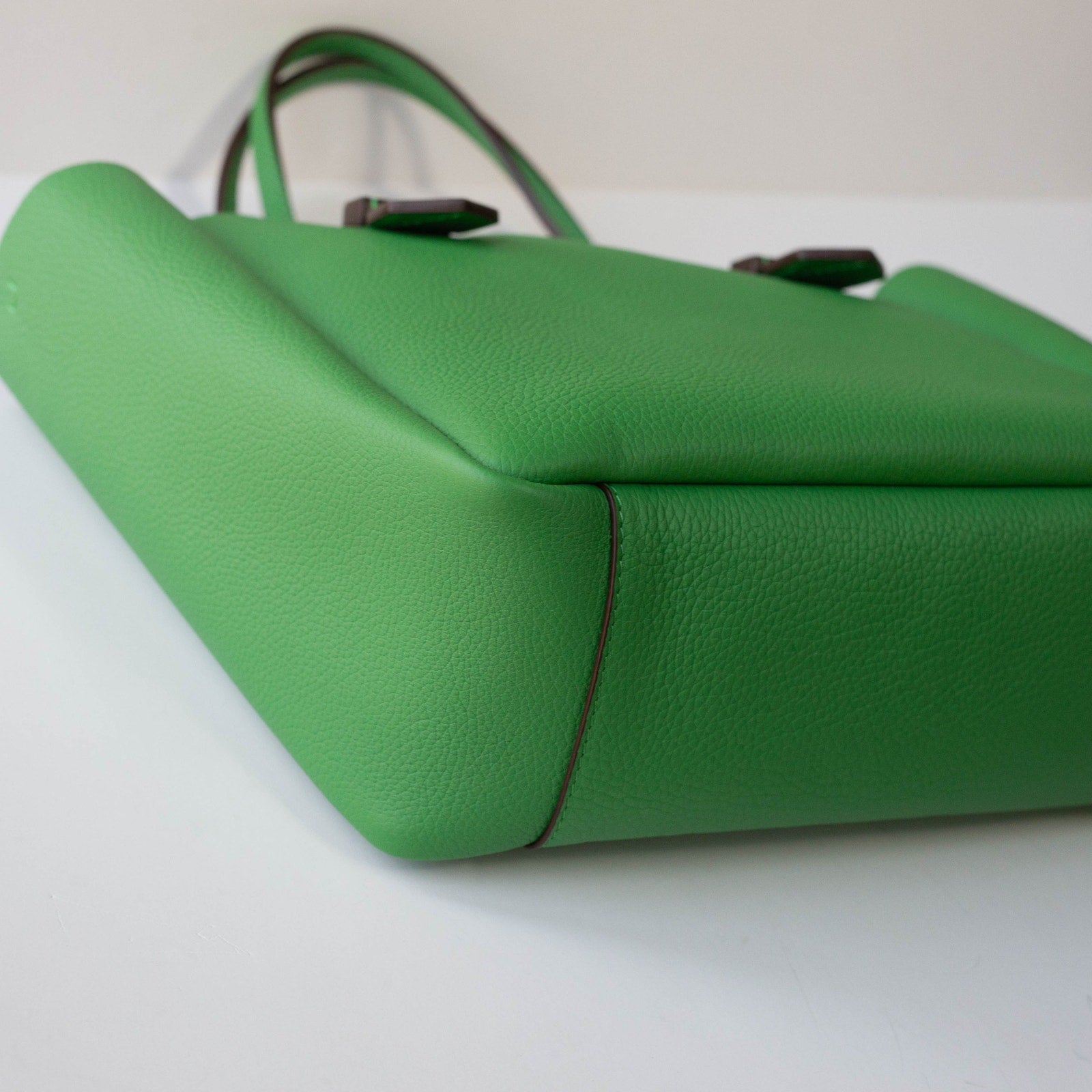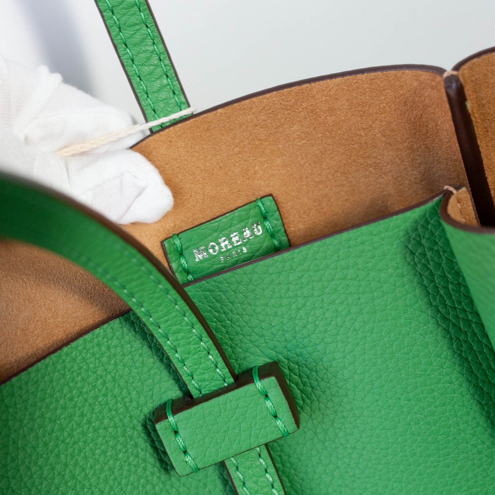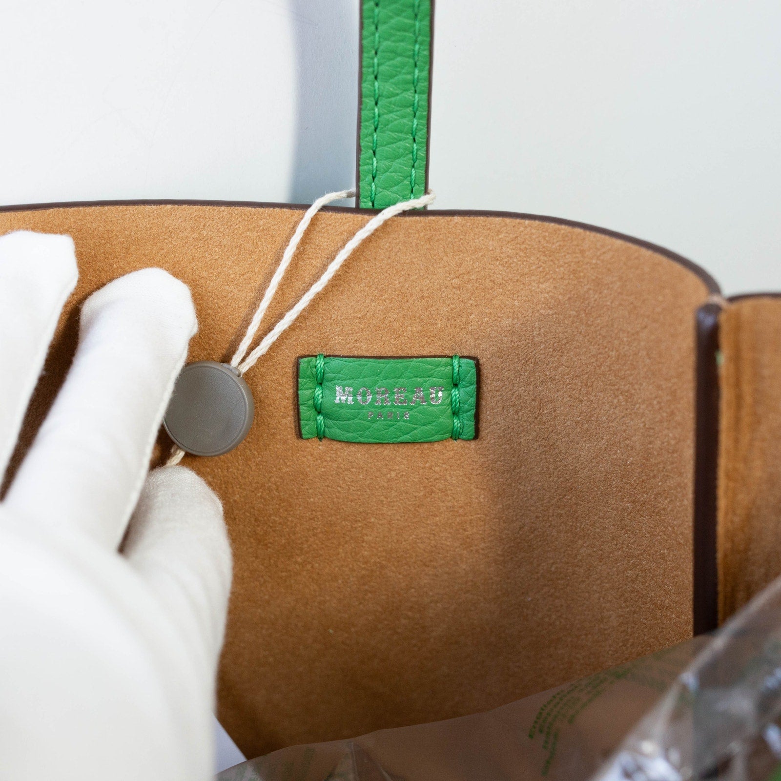 This MOREAU Paris handbag is crafted from pebbled leather. It features a top handle, double handle, detachable interior pouch, and a leather lining. It is a shopper bag with no appliques and a solid color.