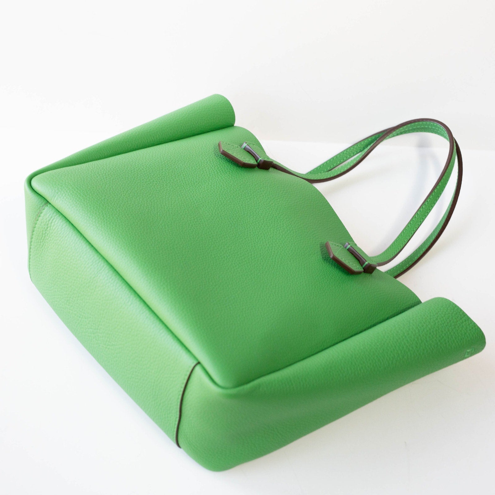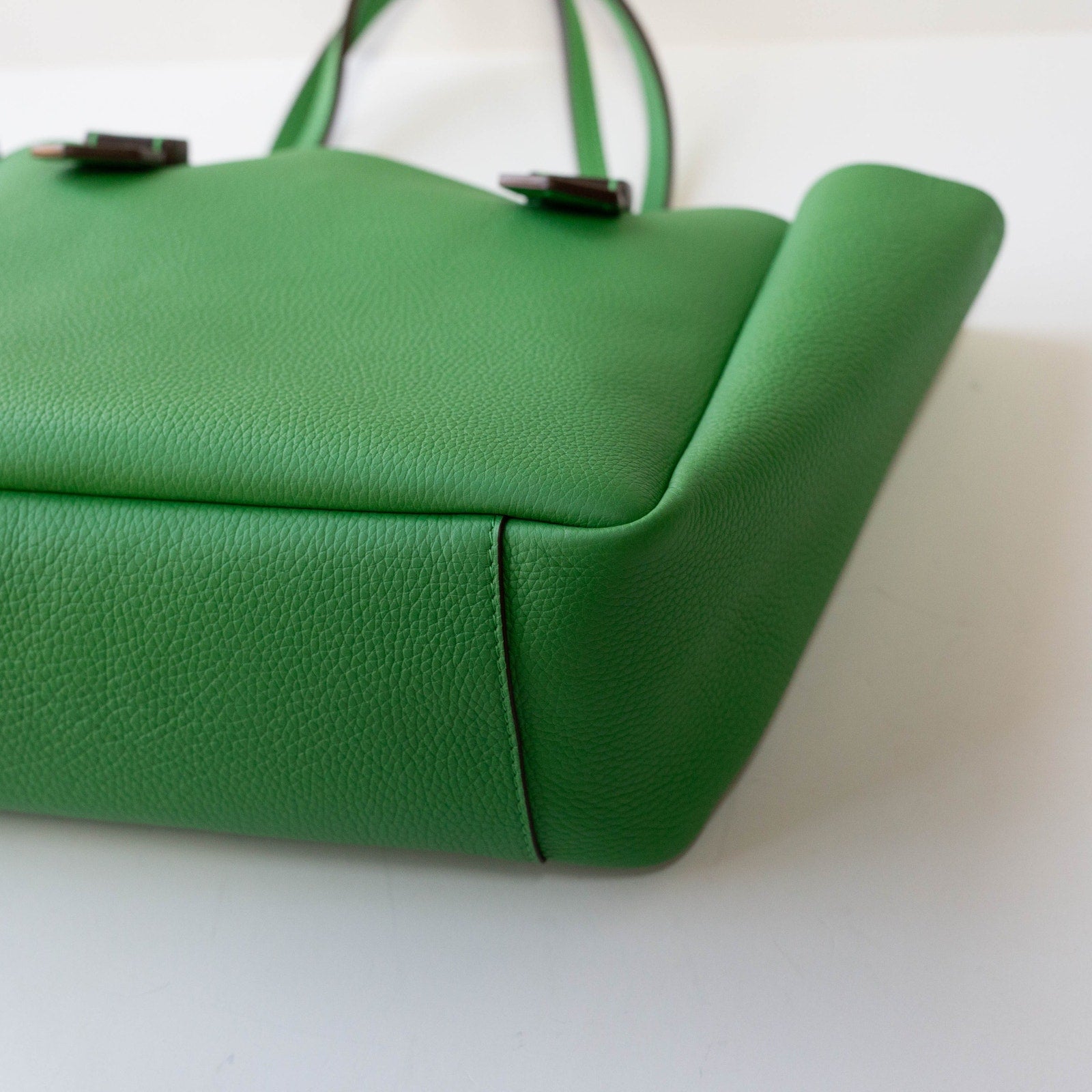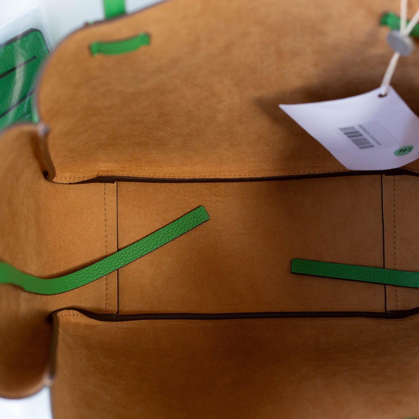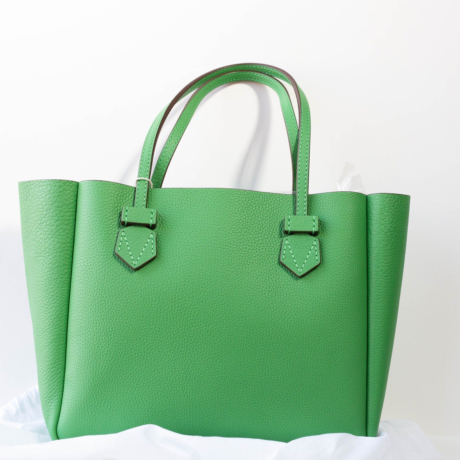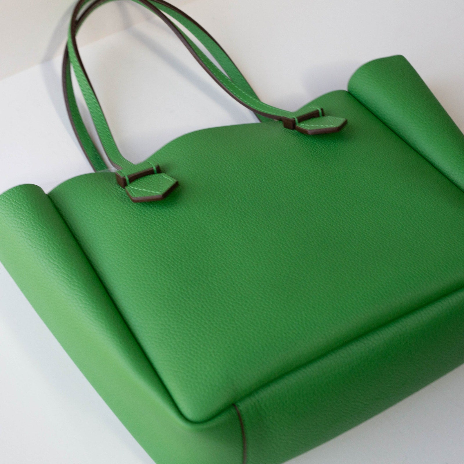 This MOREAU Paris handbag is crafted from pebbled leather. It features a top handle, double handle, detachable interior pouch, and a leather lining. It is a shopper bag with no appliques and a solid color.