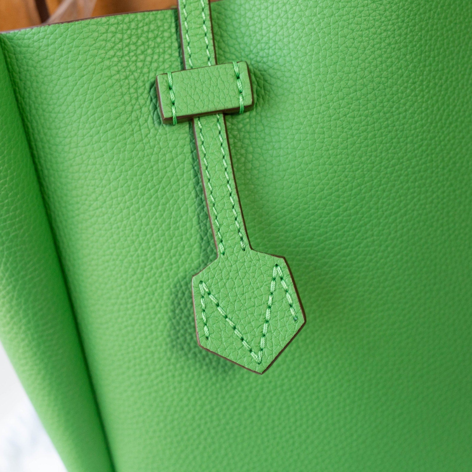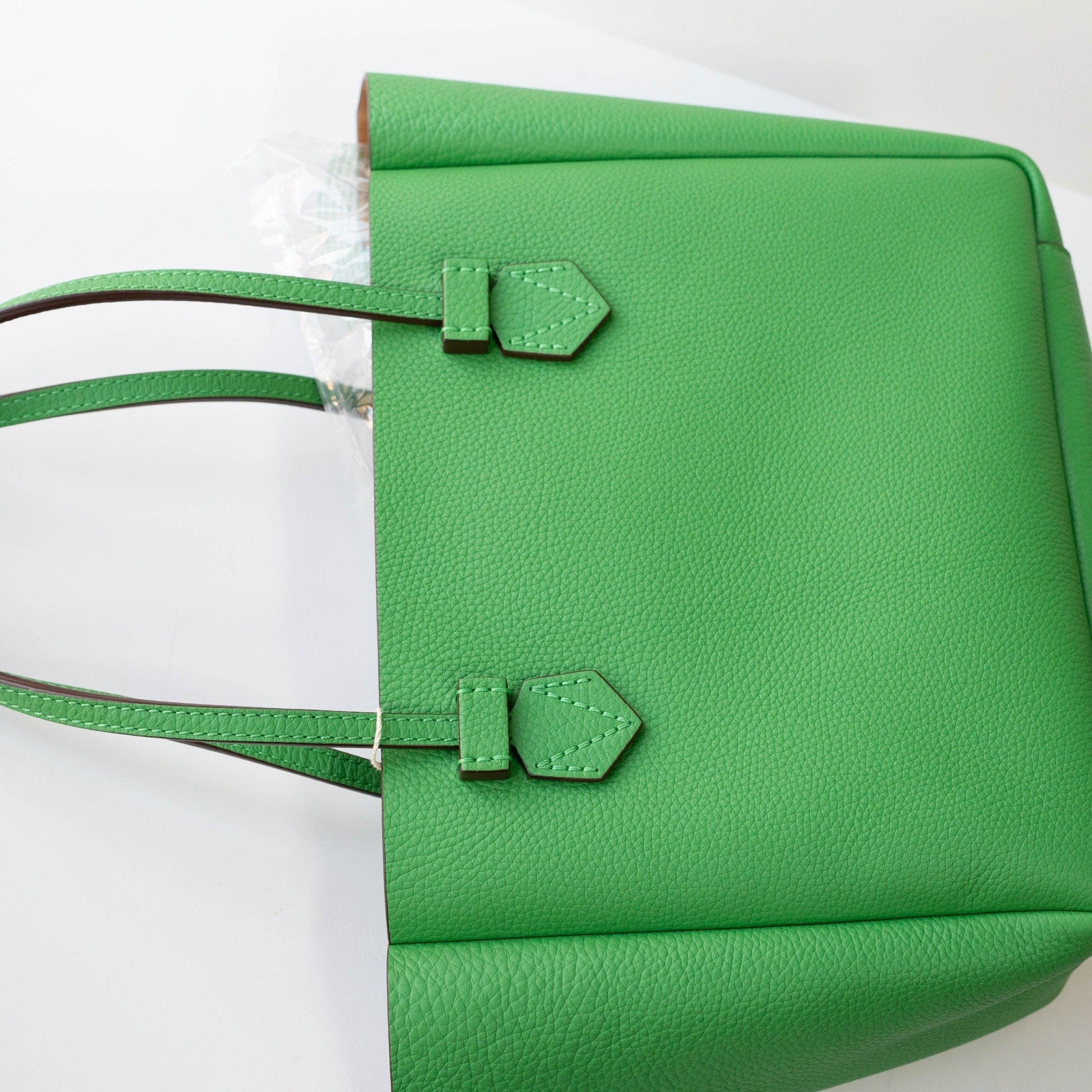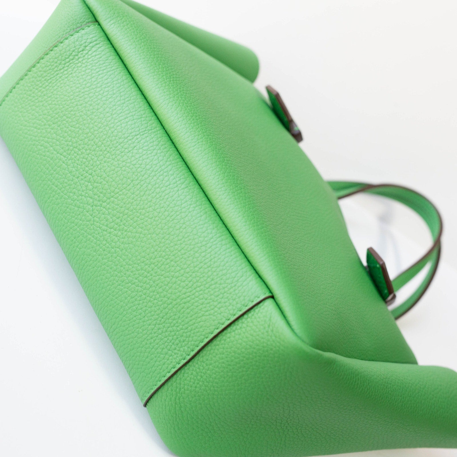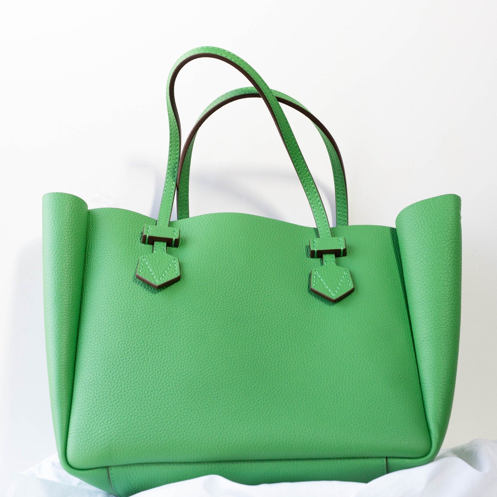 This MOREAU Paris handbag is crafted from pebbled leather. It features a top handle, double handle, detachable interior pouch, and a leather lining. It is a shopper bag with no appliques and a solid color.