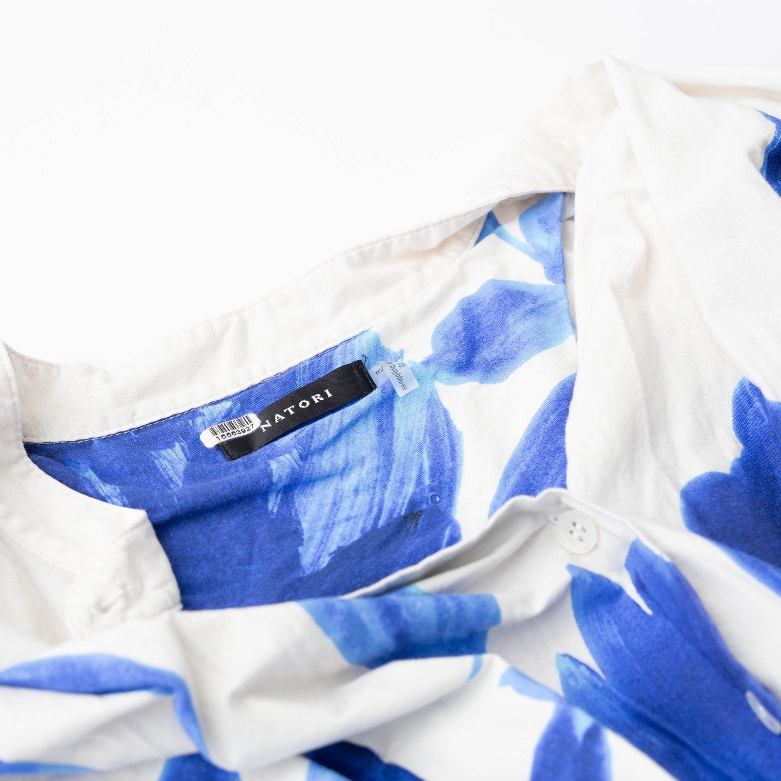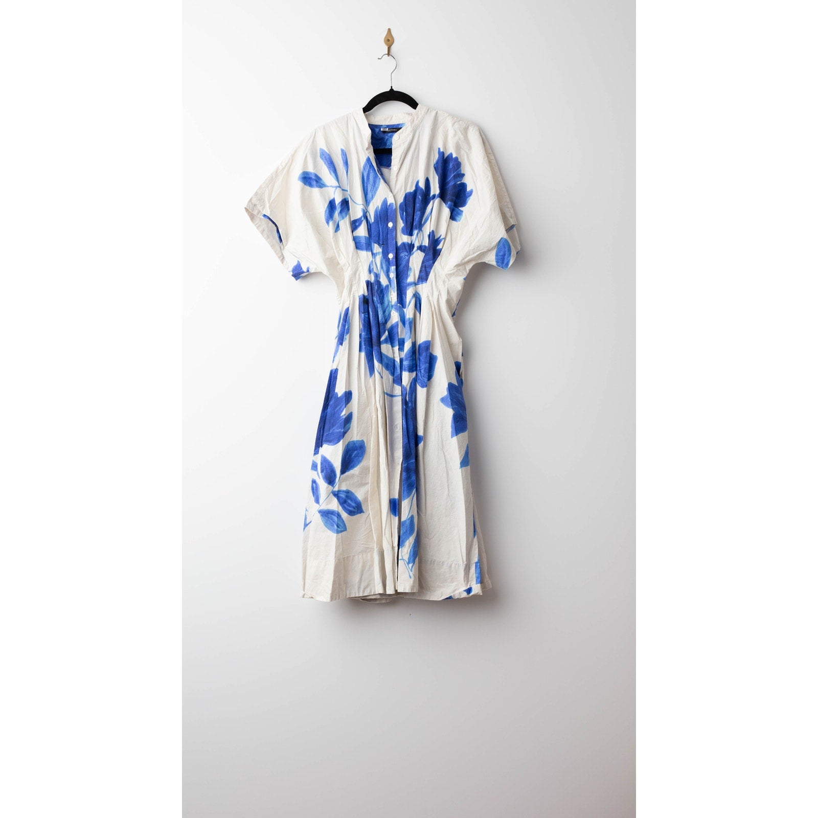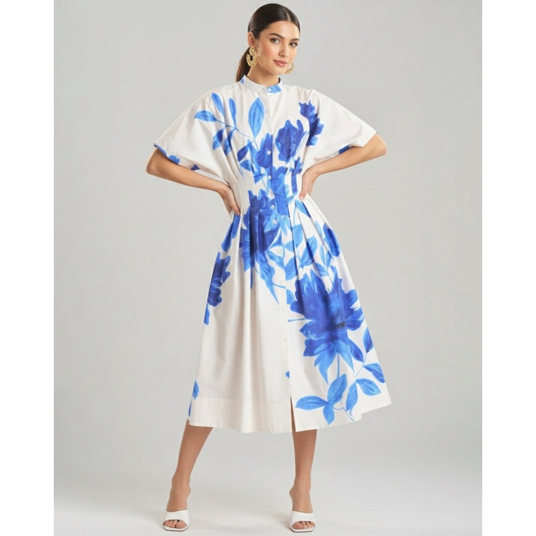 This Natori dress features a bold blue floral print on a crisp white background, creating a look that’s both fresh and artistic. The pleated waist flatters the silhouette, while a mandarin collar and button-down front add a refined touch. Perfect for brunches, garden parties, or elevated everyday wear.