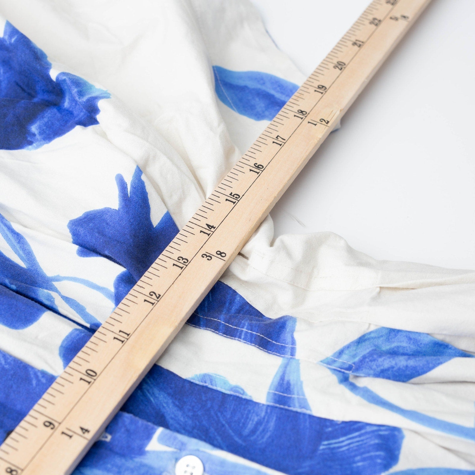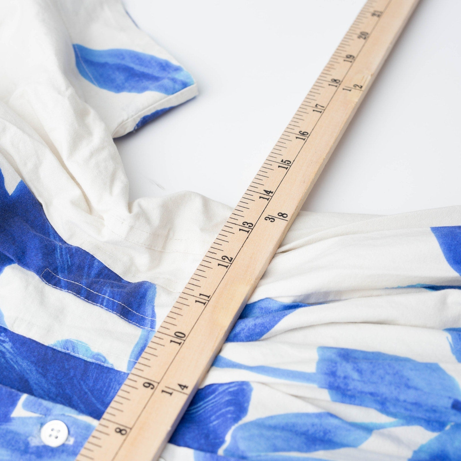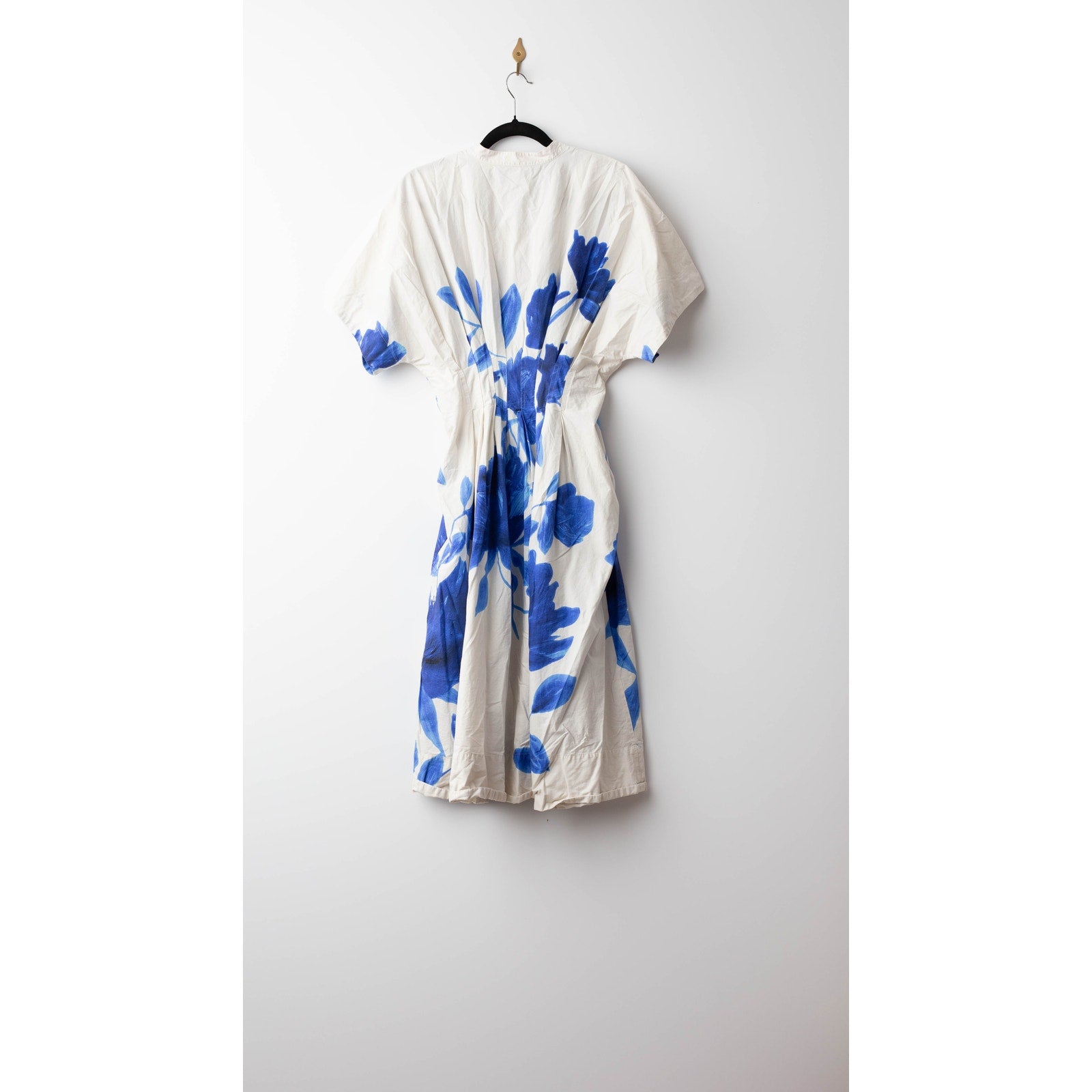 This Natori dress features a bold blue floral print on a crisp white background, creating a look that’s both fresh and artistic. The pleated waist flatters the silhouette, while a mandarin collar and button-down front add a refined touch. Perfect for brunches, garden parties, or elevated everyday wear.