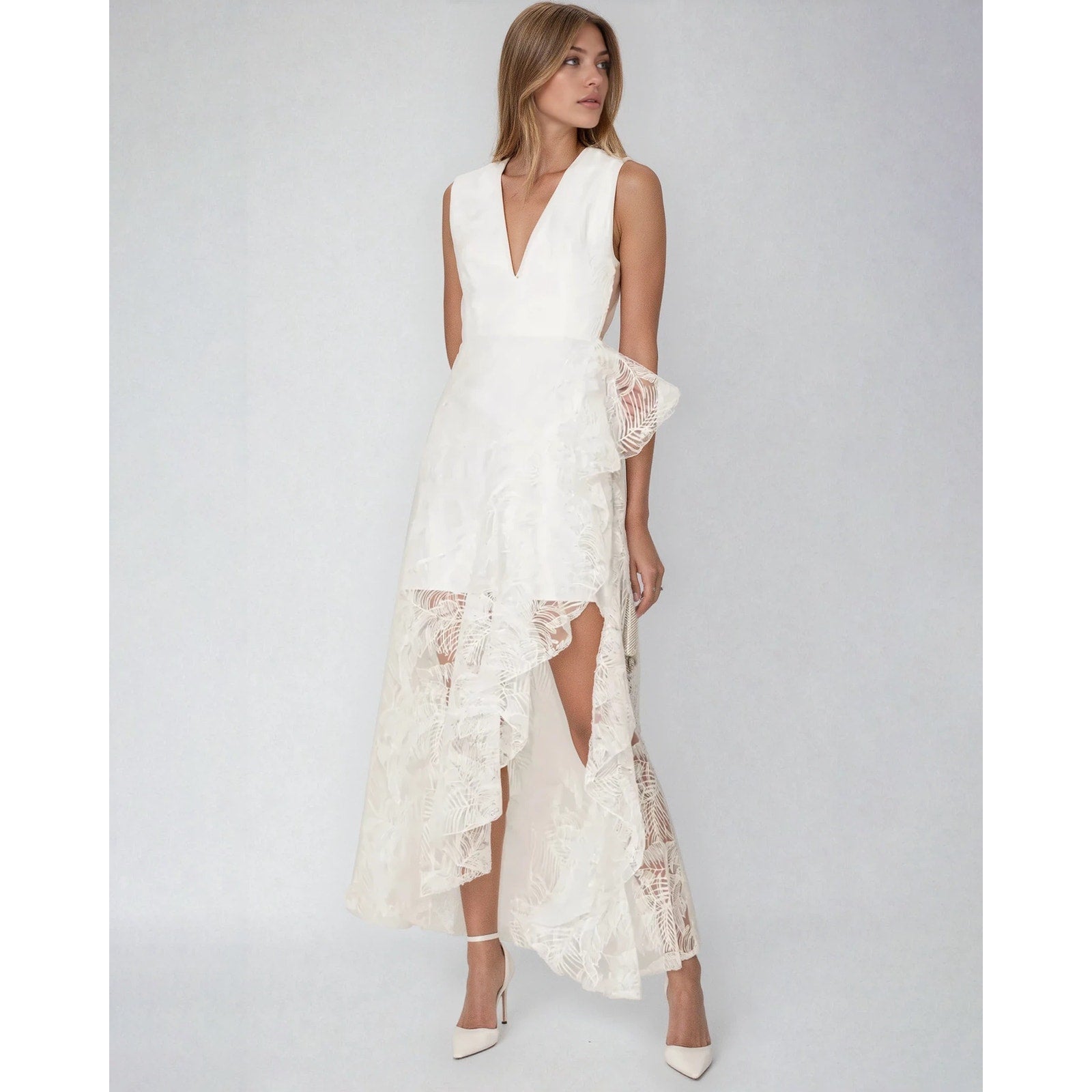 Details: Sheer overlay, plunging V-neck, sleeveless, asymmetric hem, back zipper closure
