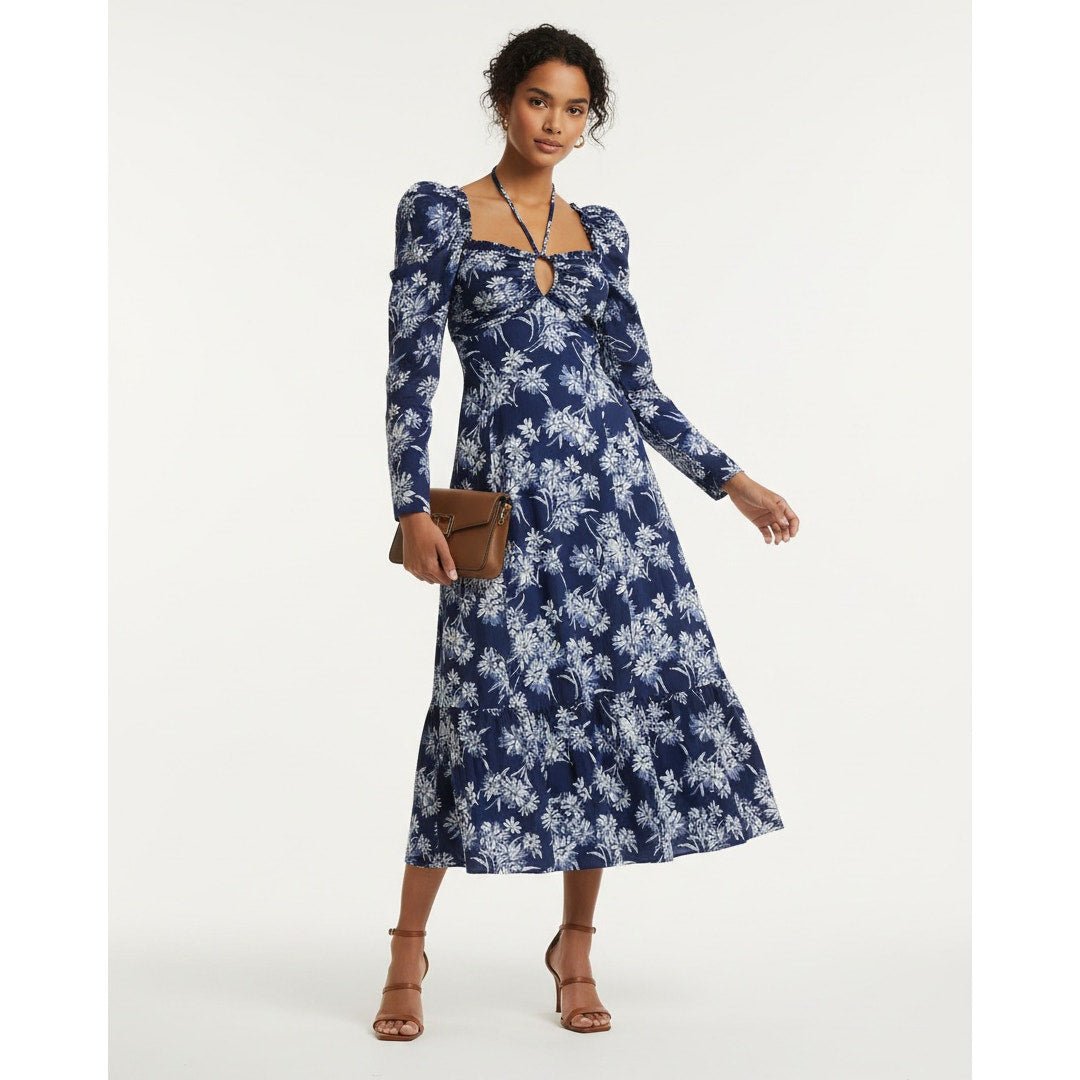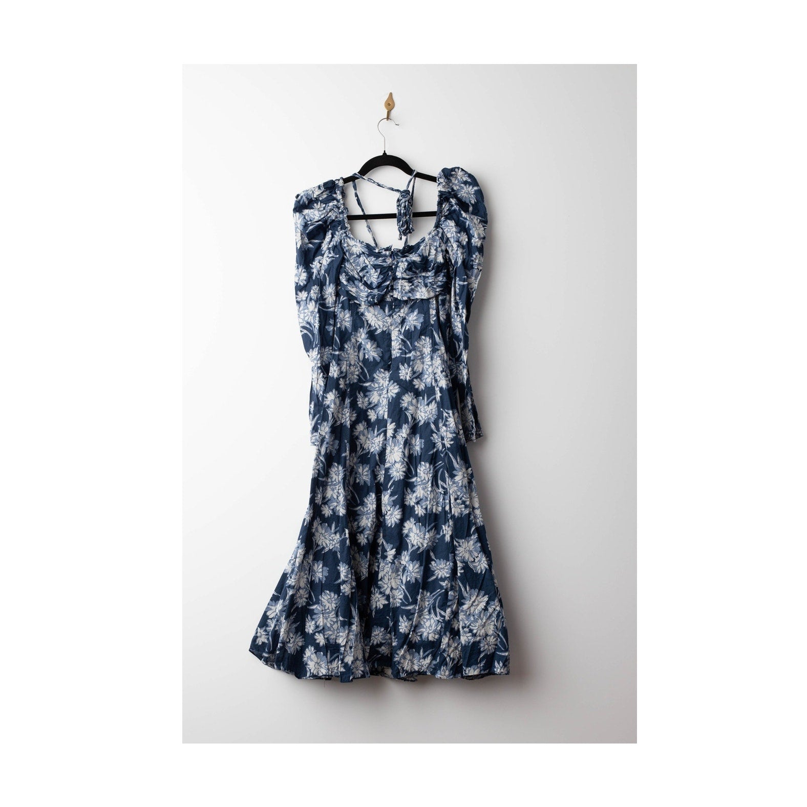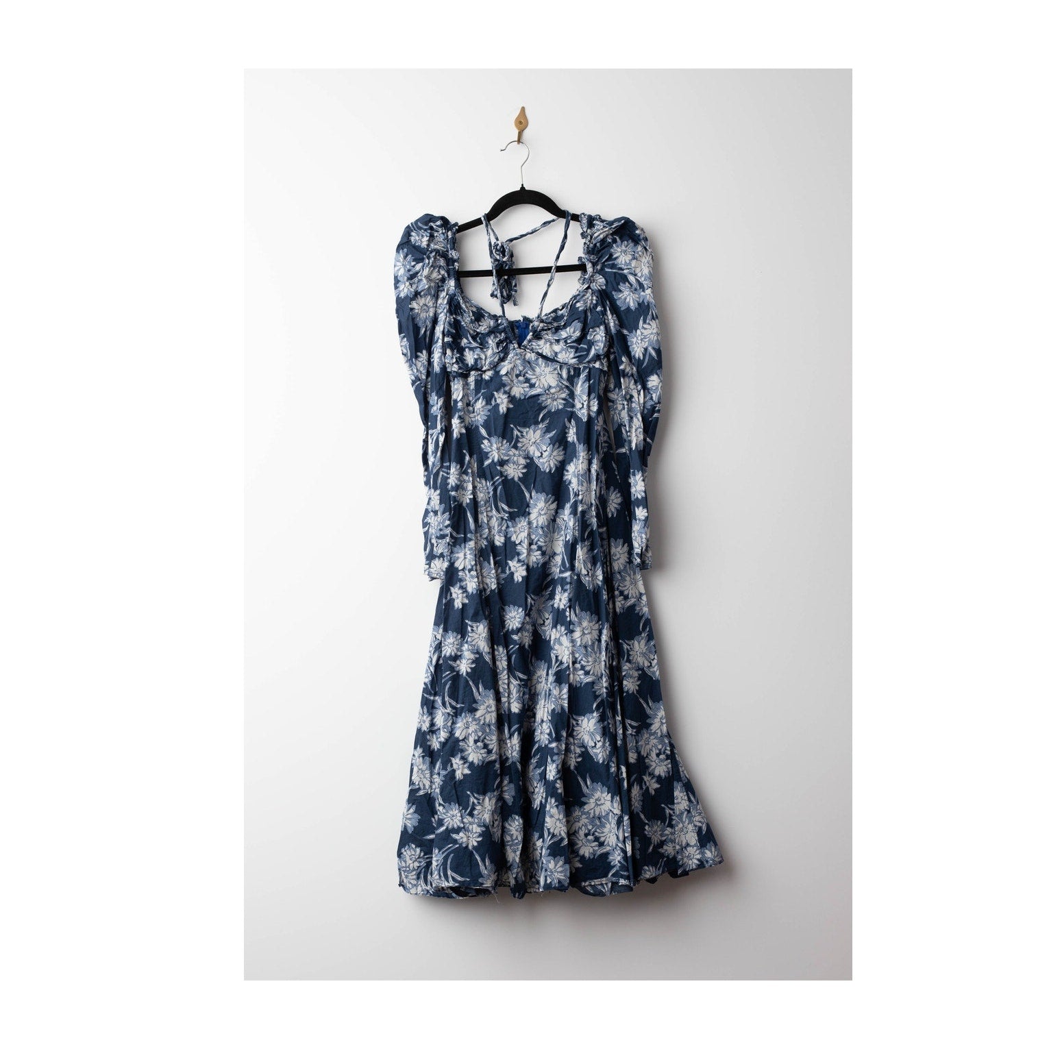 Crafted from lightweight floral-print cotton, this elegant dress features dramatic mutton sleeves and a shirred bodice with a keyhole neckline and twisted halter ties. The paneled construction adds a refined finish, while the lined body ensures comfort and coverage.