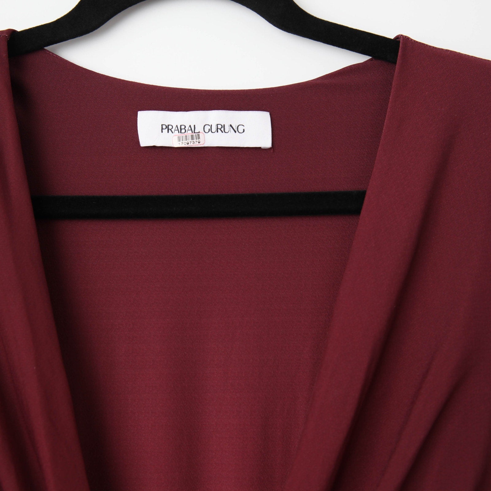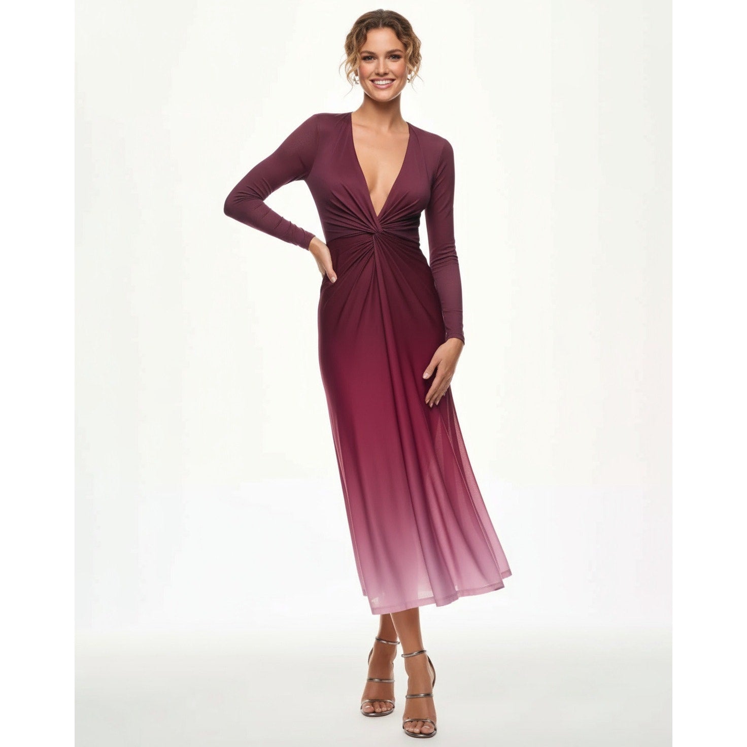 This Prabal Gurung dress embodies refined sophistication, featuring a deep V-neckline, a gathered twist waist, and a flowing ombre skirt that moves gracefully with every step. Designed in a luxurious viscose blend, this piece seamlessly combines structure and softness — perfect for cocktail events or formal evenings.