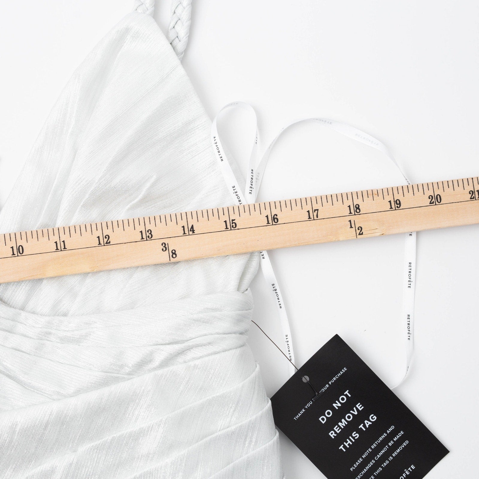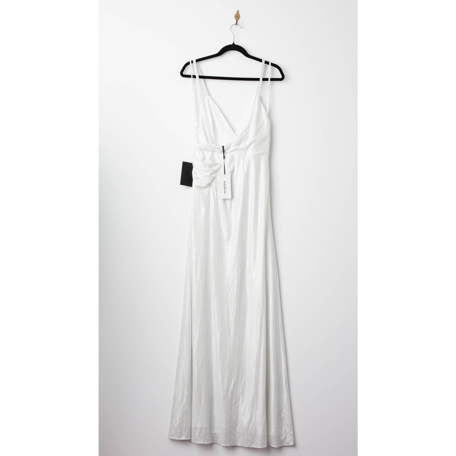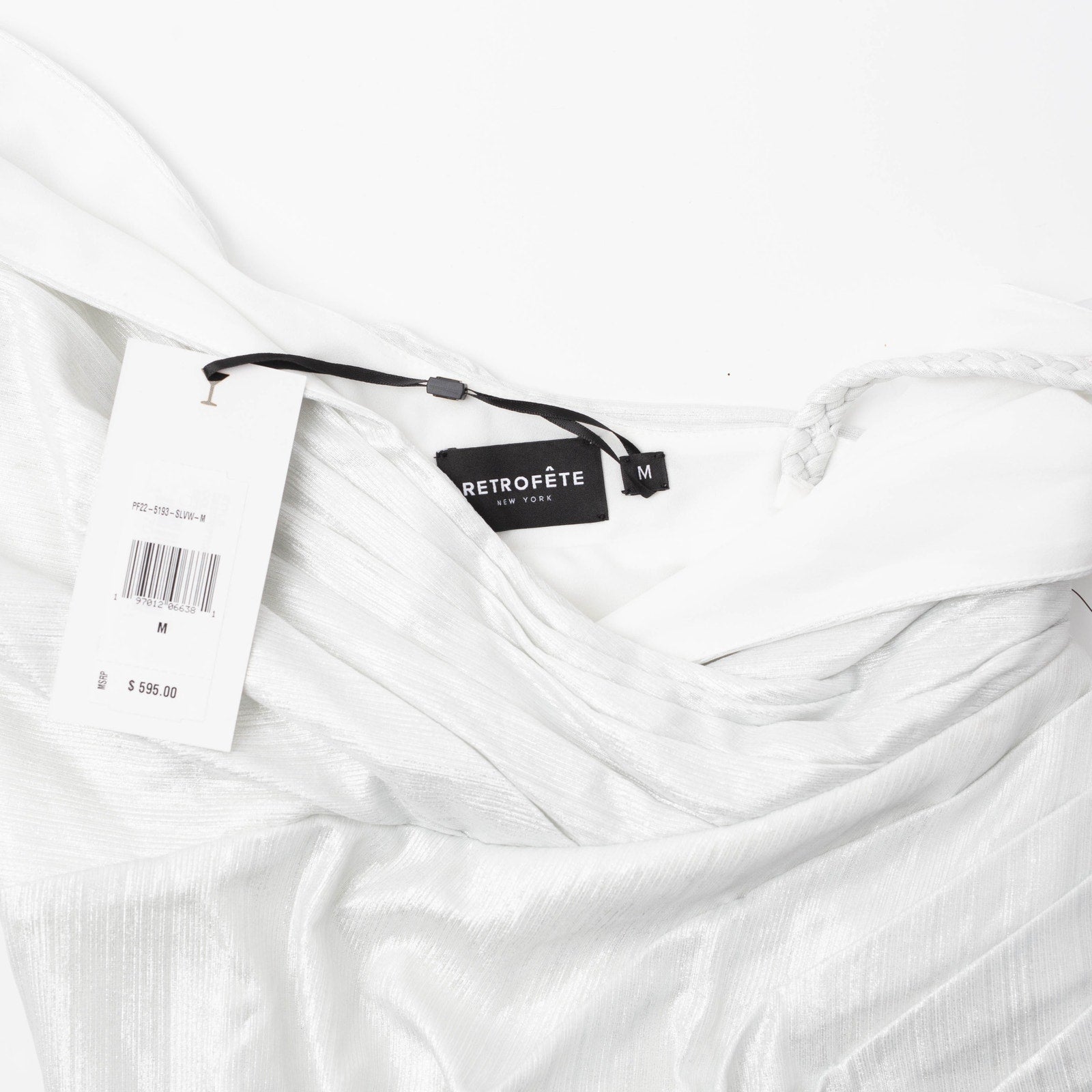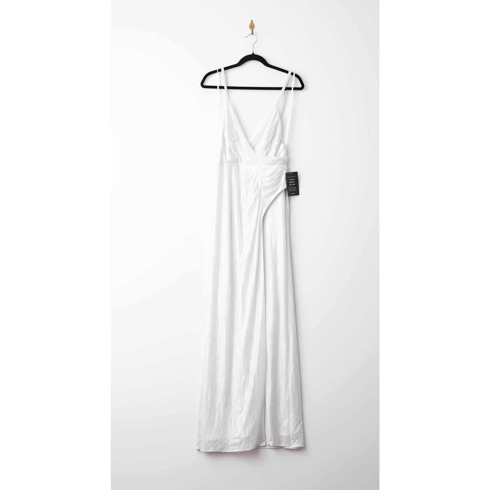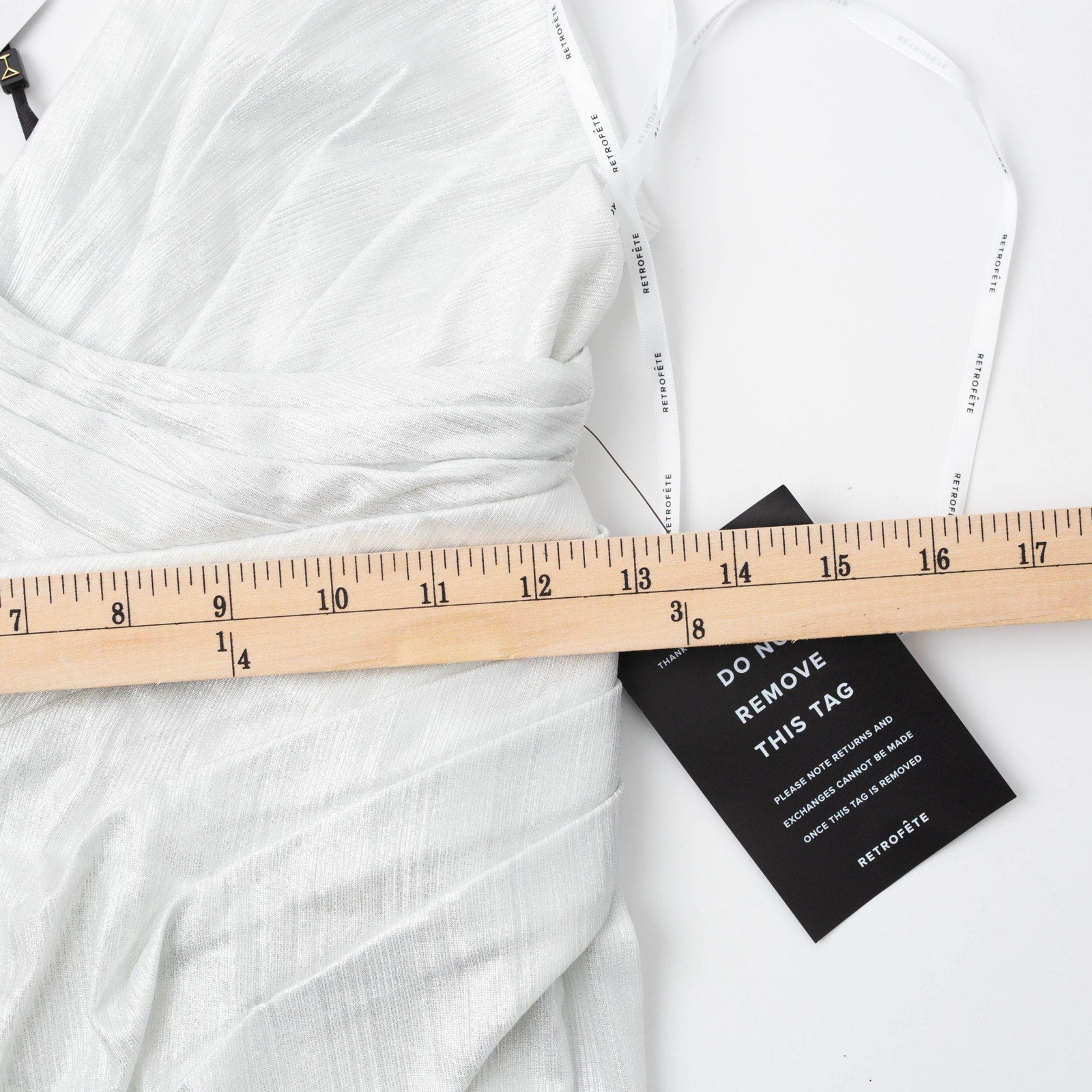 Turn heads in this glamorous metallic lamé evening gown from Retrofête. With its crossover V-neckline, pleated faux-wrap bodice, and asymmetric open back, this dress strikes the perfect balance of drama and sophistication. A thigh-high slit and braided shoulder straps complete the look, making it an unforgettable choice for evening events or special occasions.