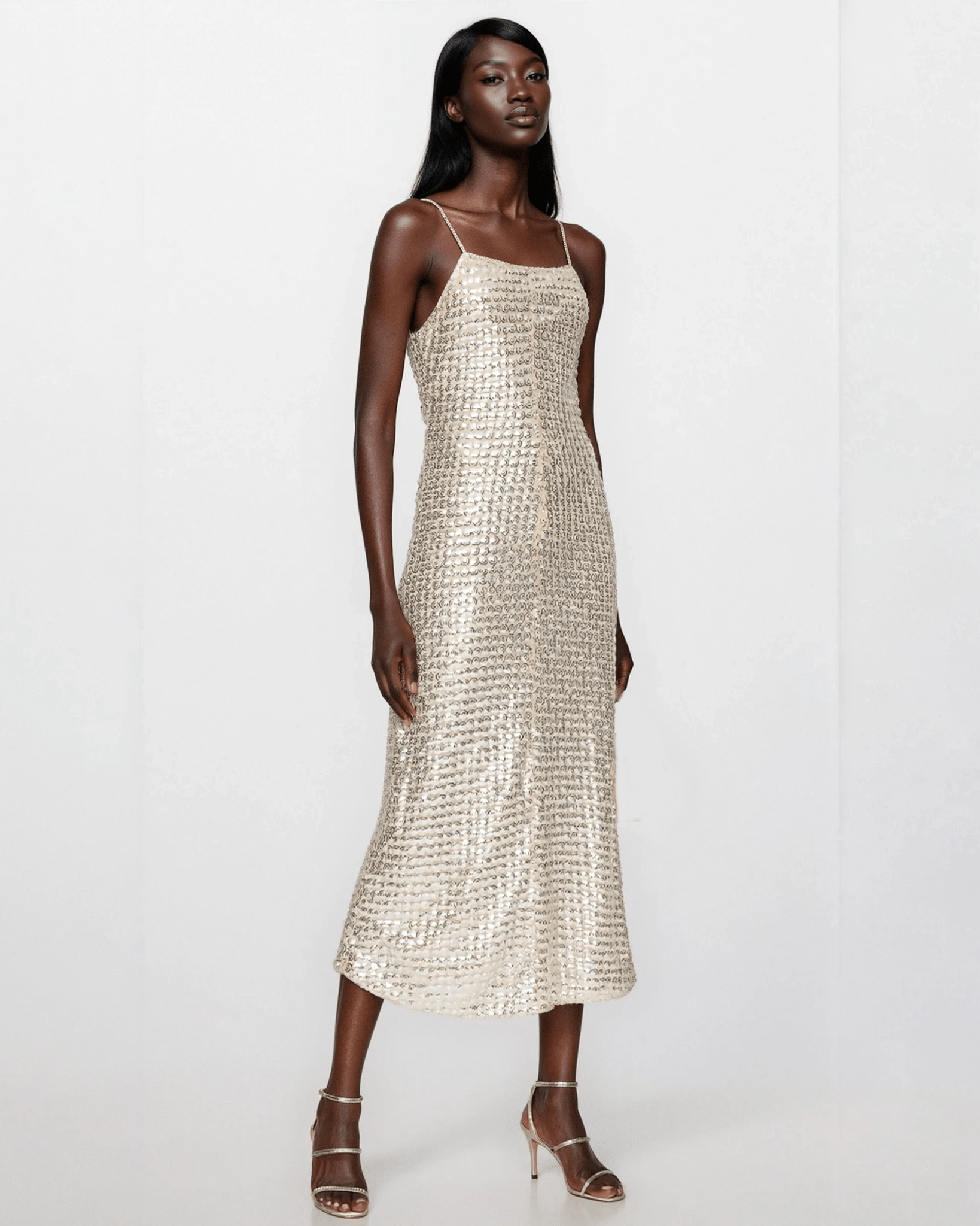 Effortlessly glamorous, this silver sequin slip dress shimmers with understated elegance. Crafted from pure silk, its square neckline and fluid silhouette make it perfect for evening events or festive occasions — timeless, minimal, and beautifully refined.