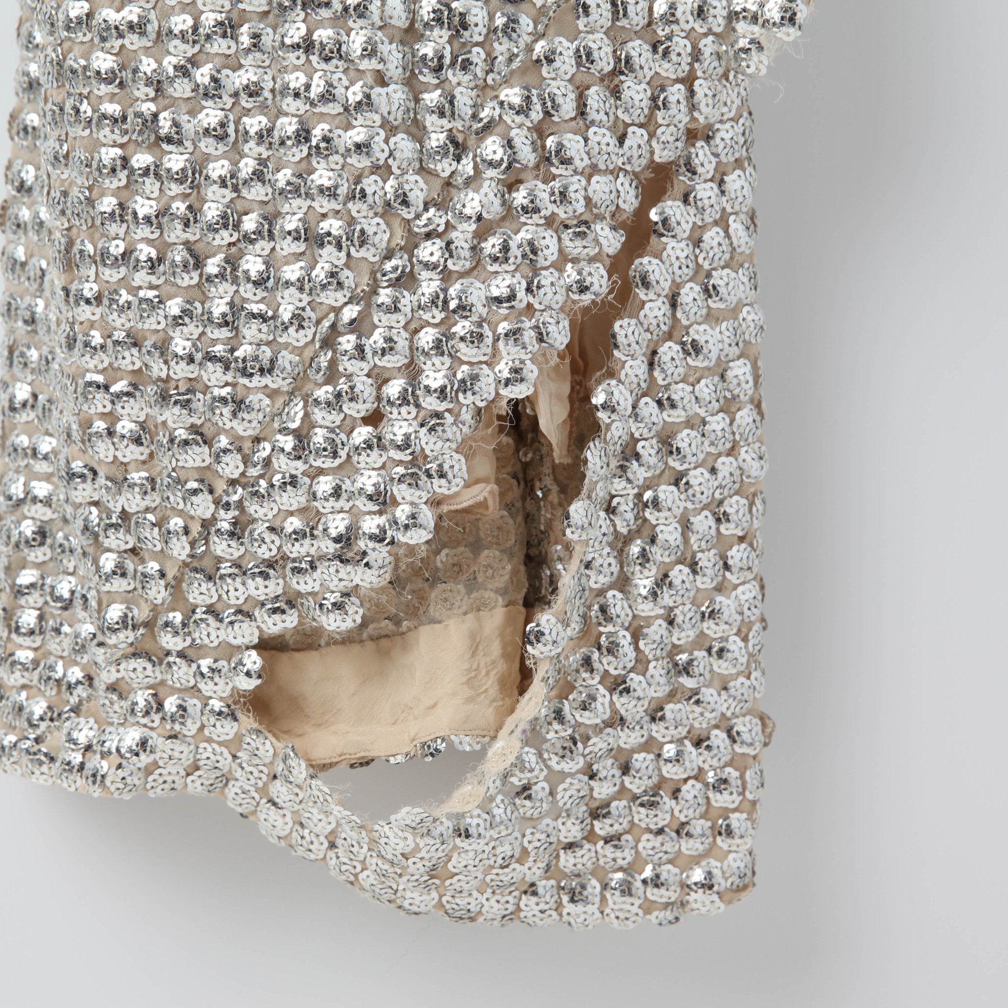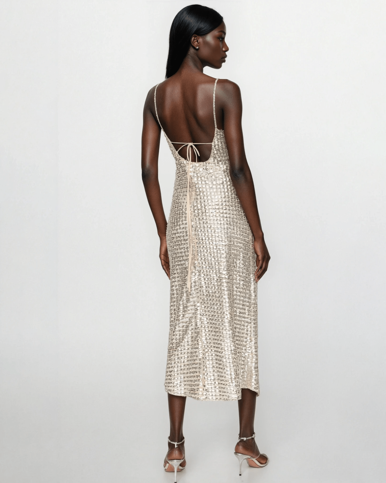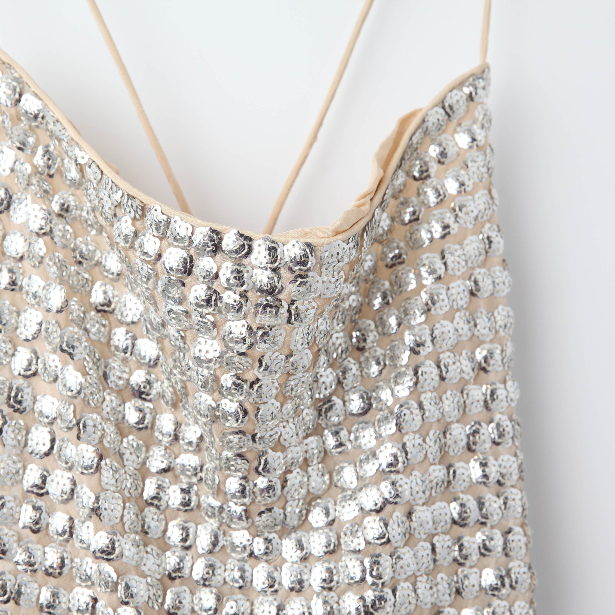 Radiant yet understated, this silver sequin slip dress by RHODE captures the essence of effortless glamour. Crafted from pure silk, it drapes beautifully with a square neckline, tie closure, and a fluid silhouette that shimmers softly with every movement. A timeless piece — full of grace, texture, and character — now carrying a story of renewal.