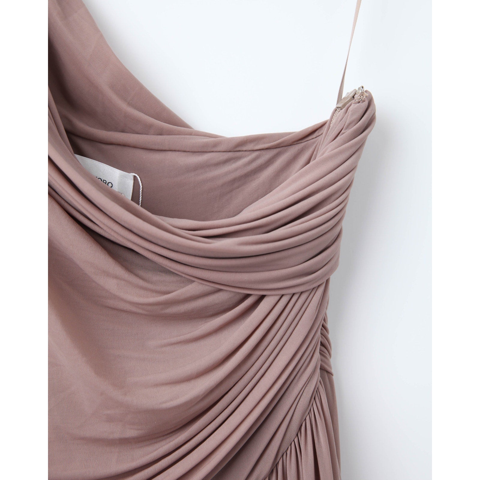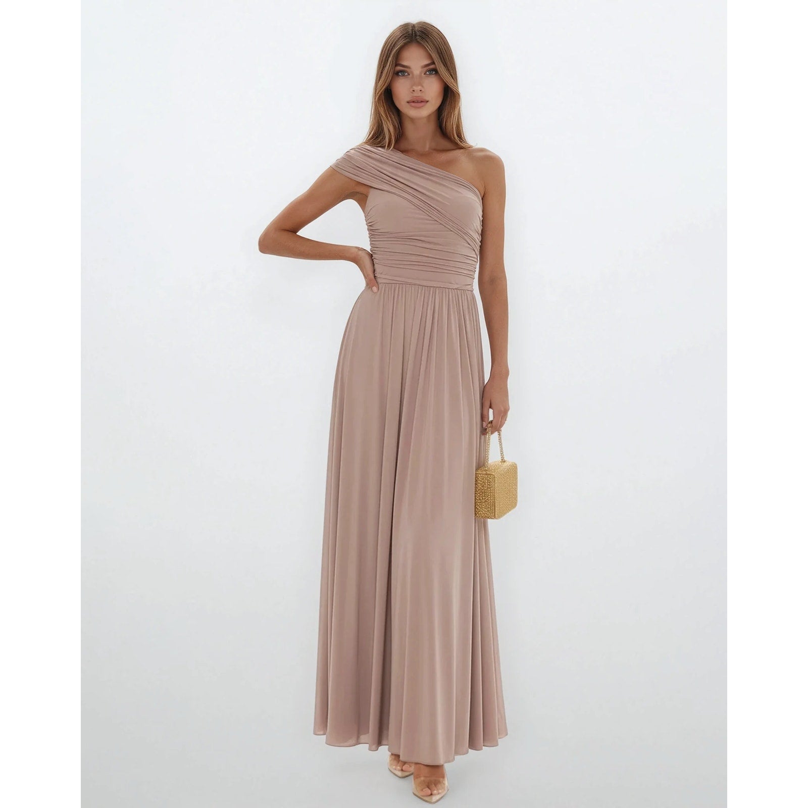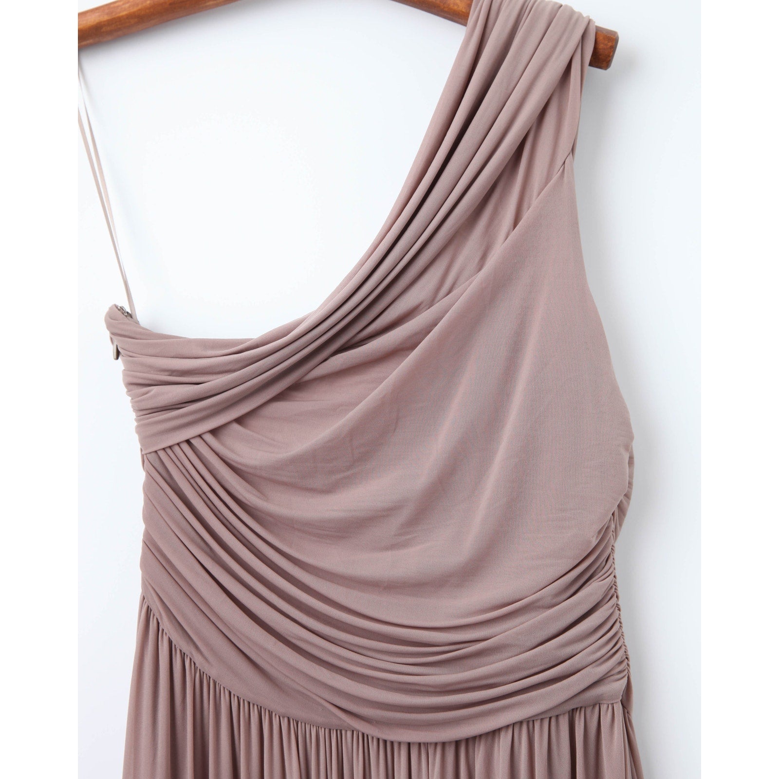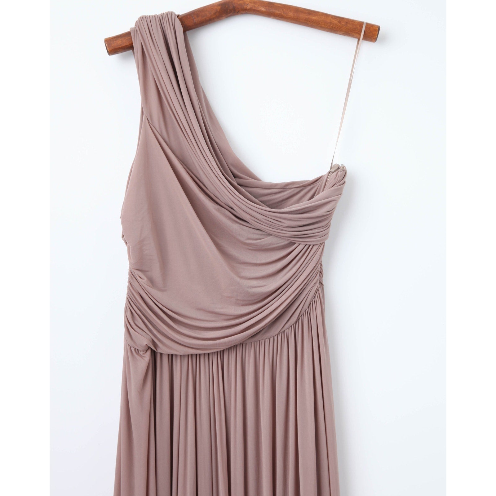 - Details: One-shoulder neckline, pleated bodice, flowing skirt, side zipper closure