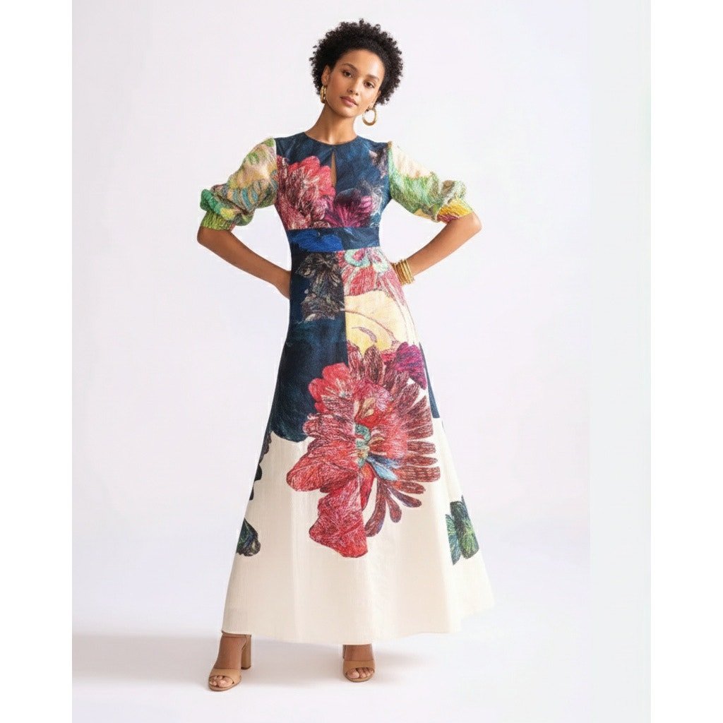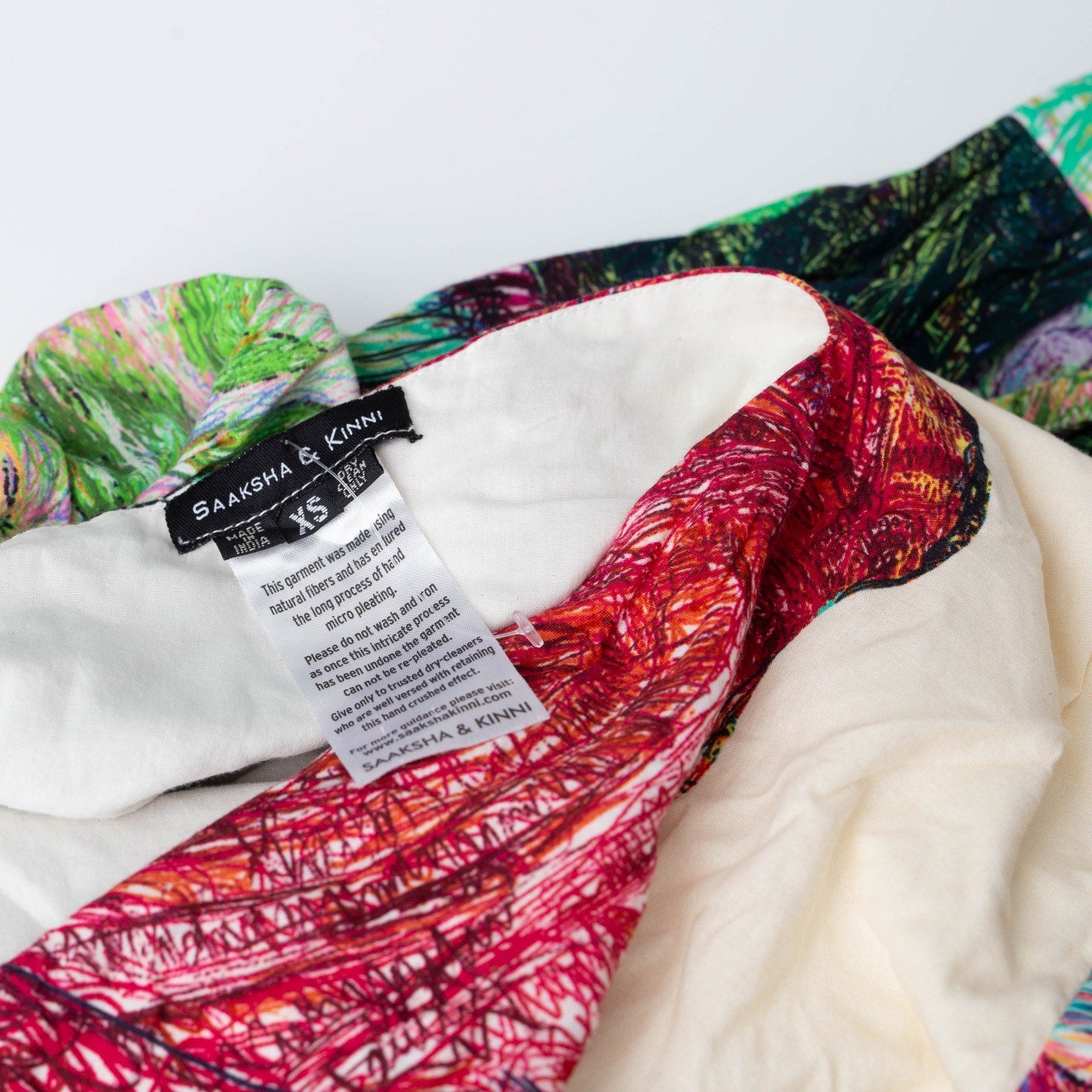 The Saaksha & Kinni Daisy Dress is a vibrant floral piece that combines traditional Indian craftsmanship with contemporary design.