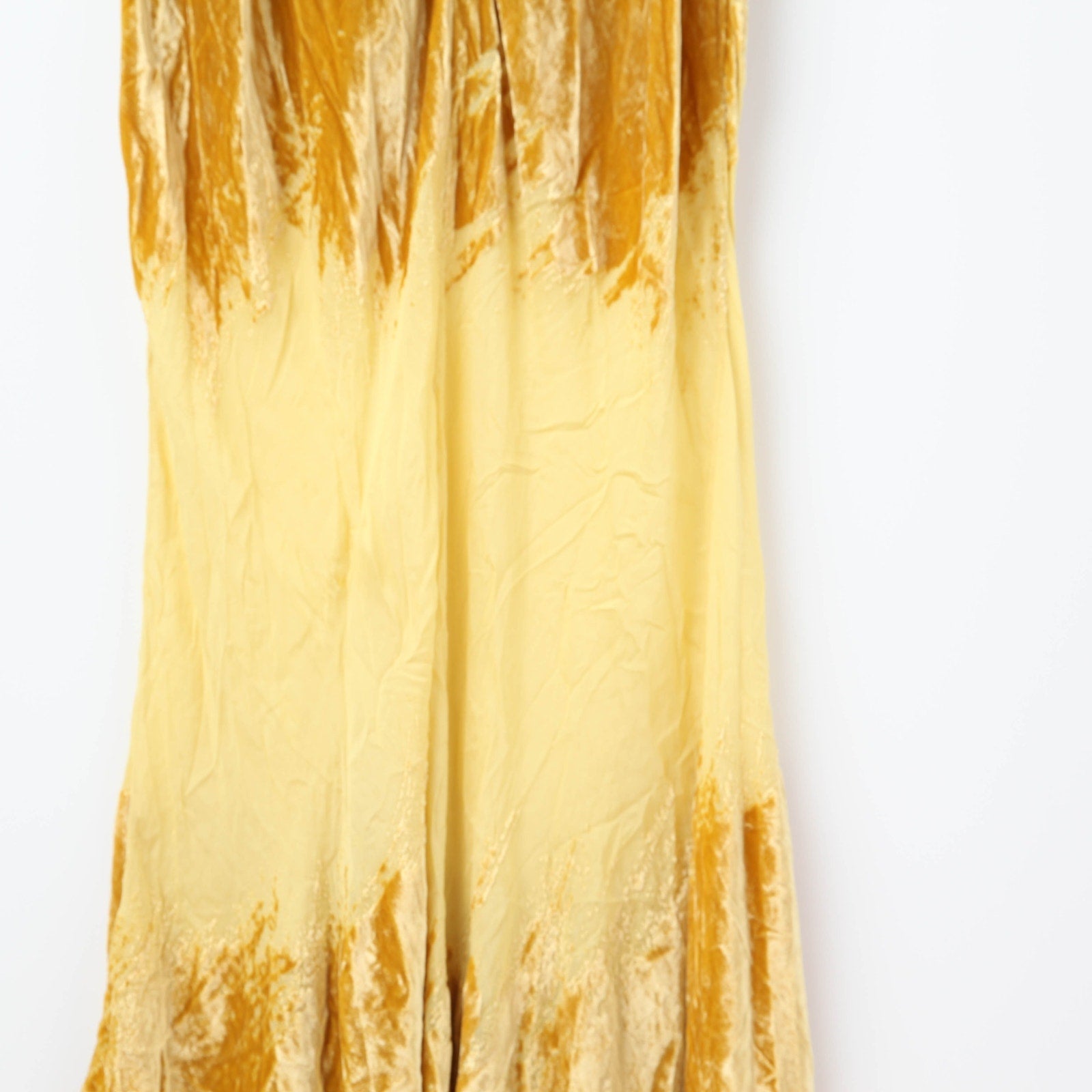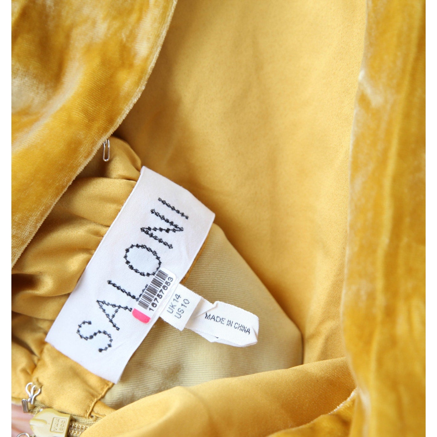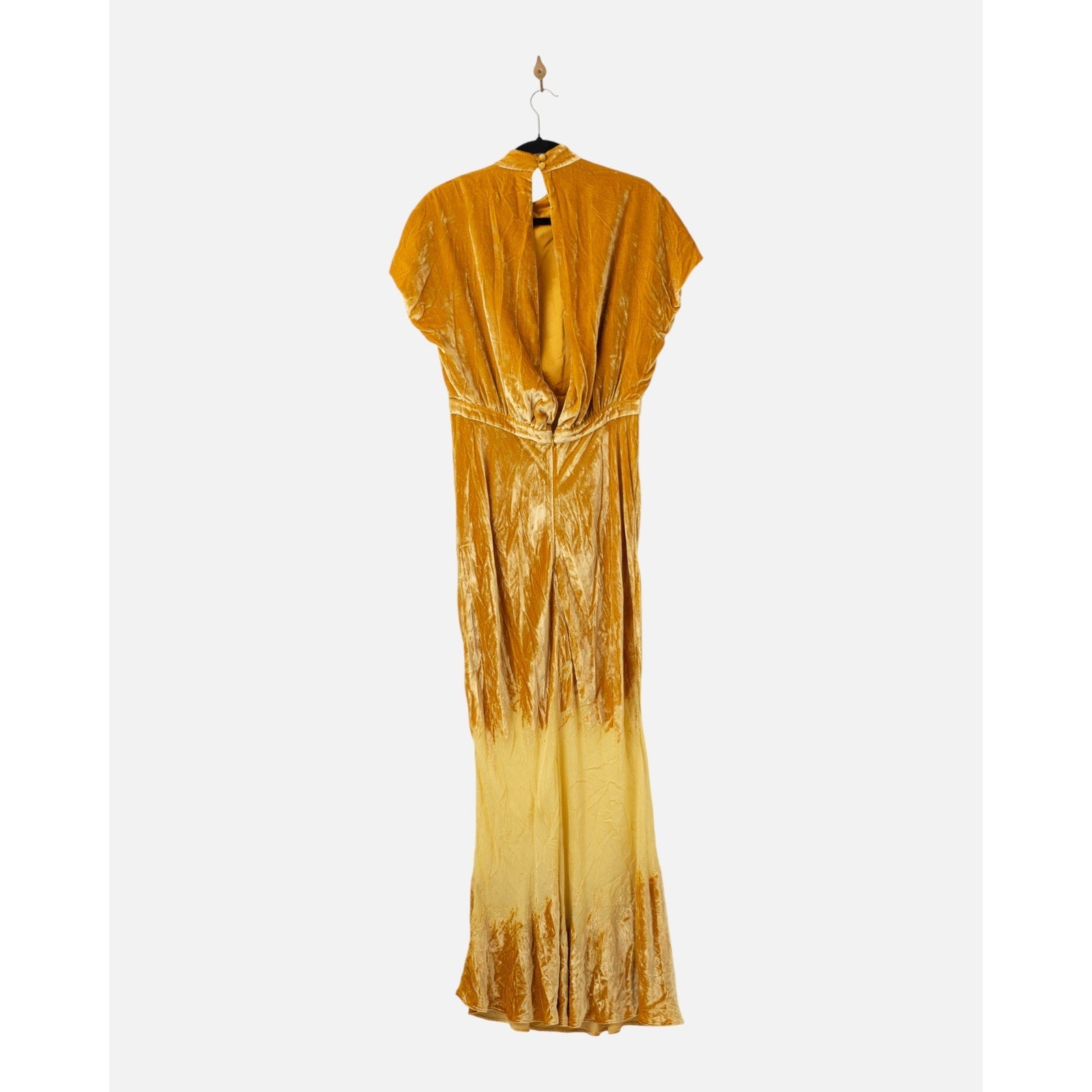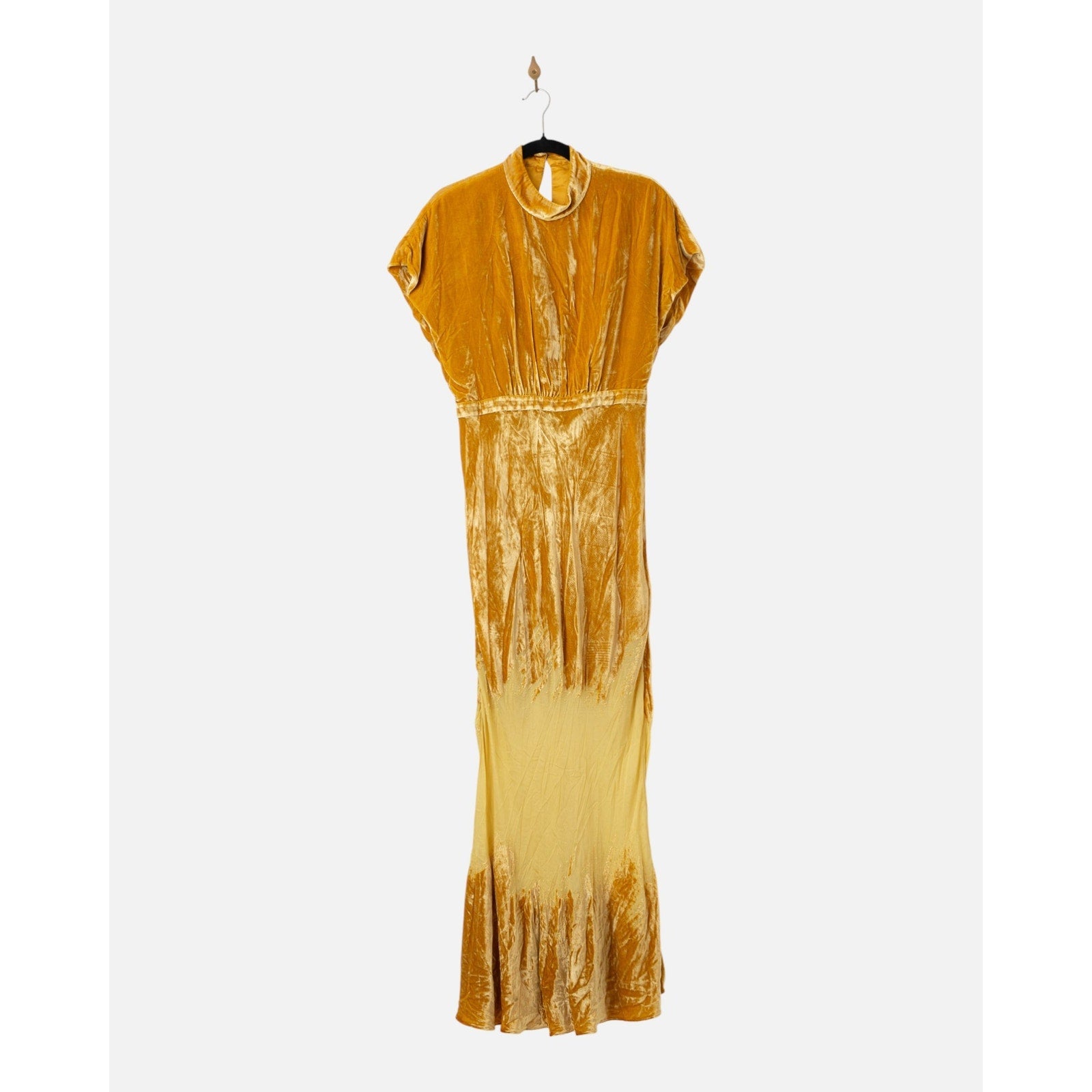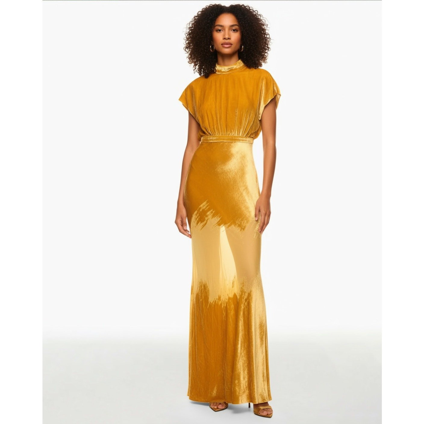 Radiating luxury and poise, this SALONI gown captivates with its soft velvet texture and gradient golden hue. Featuring a high neckline, cinched waist, and a fluid floor-length skirt, it embodies effortless glamour — a perfect choice for evening events or special occasions.