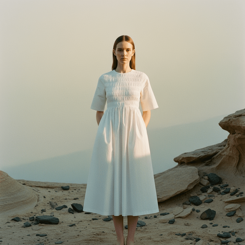 A smocked bodice and nostalgic silhouette define the Diddy Dress by Sandy Liang, crafted in crisp white cotton for a timeless yet playful look. With its empire waist, short sleeves, and hidden back zipper, this piece blends comfort, structure, and effortless femininity — perfect for warm days or layered styling.