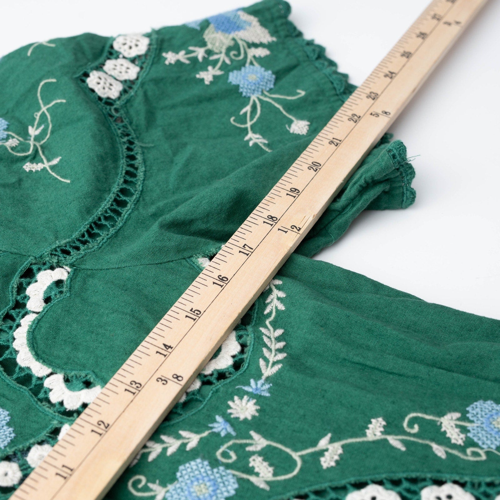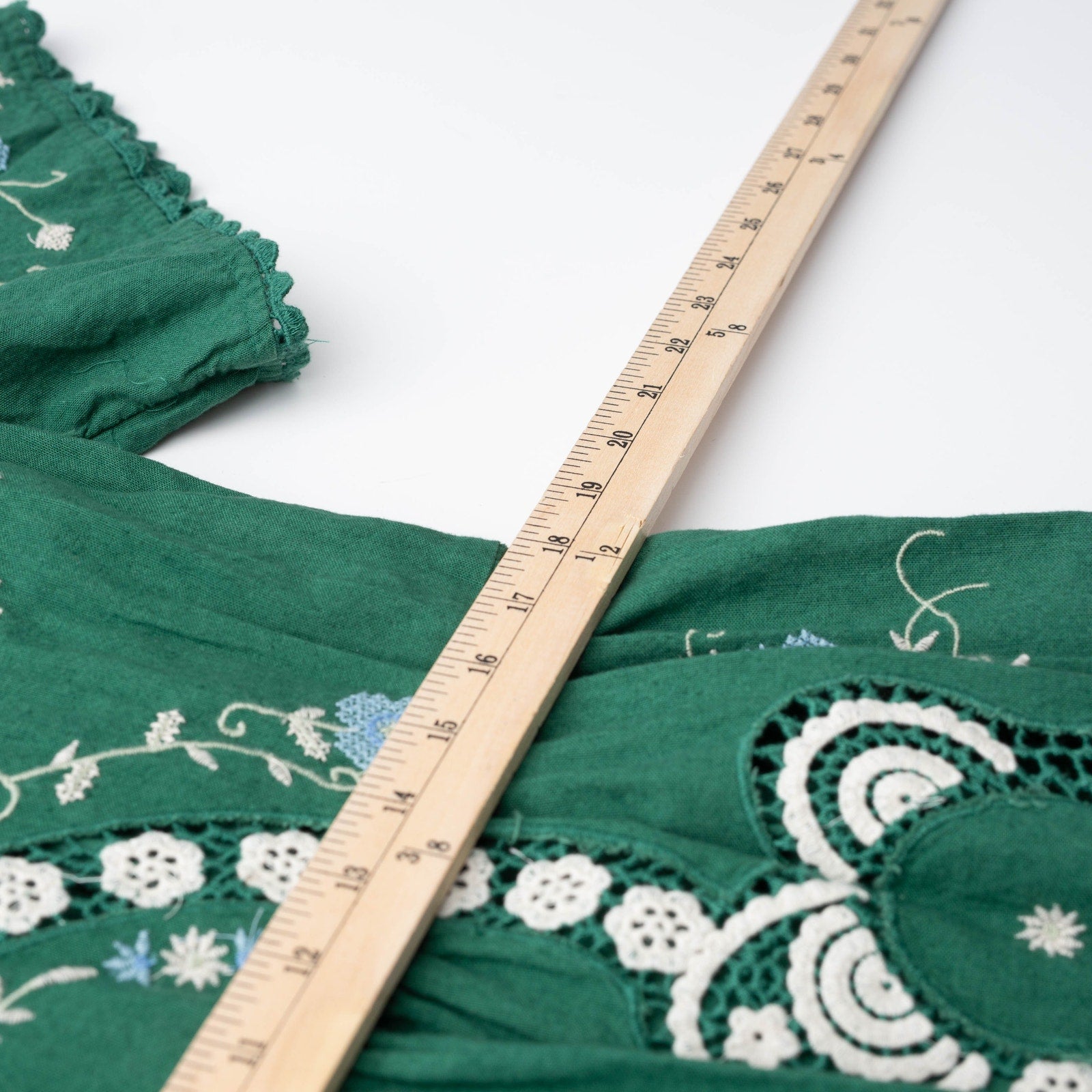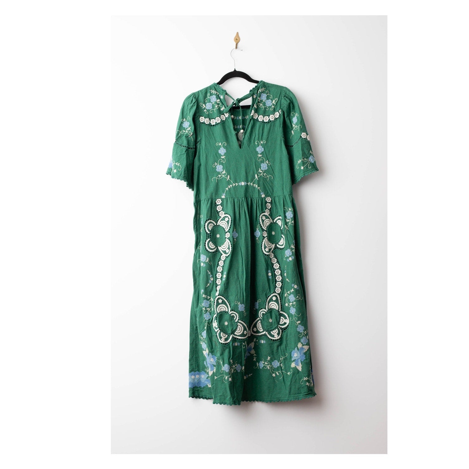 Green floral (Self: 88% Cotton, 12% Linen; Lining: 100% Cotton; Embroidery thread: 100% Polyester). Casual Dress. Crew Neck. 3/4 Sleeves. Tie closure.