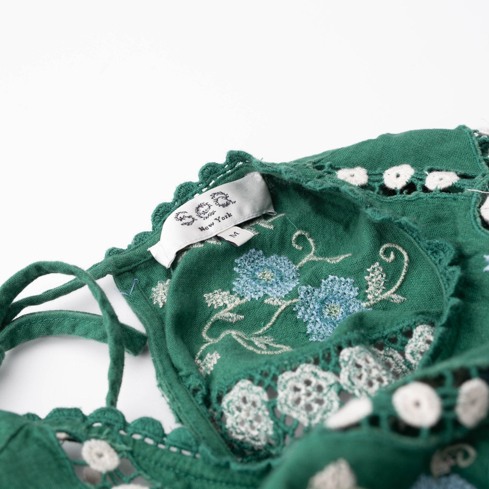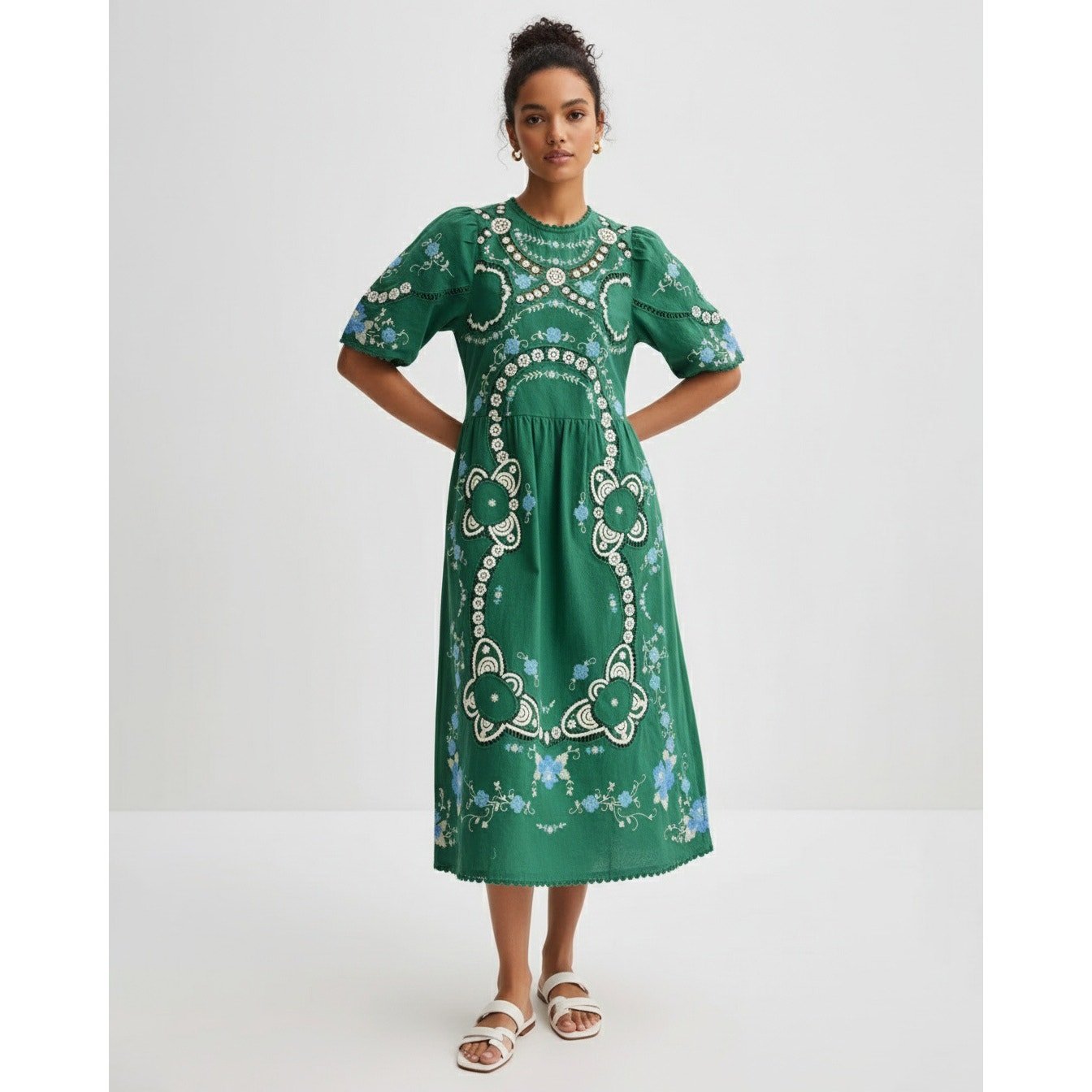 The Vesna Embroidered Dress by is a romantic midi dress adorned with delicate floral embroidery and lace accents.